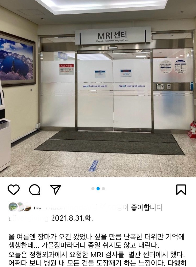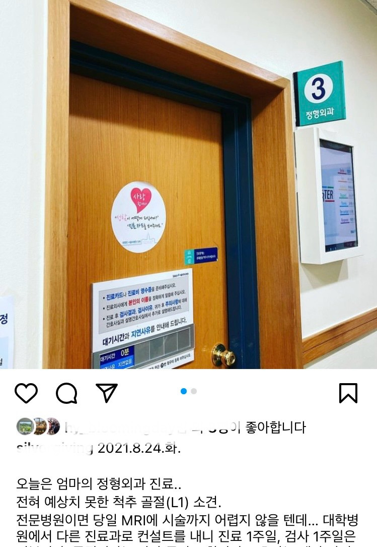 고생하시던 항암 치료가 끝나고 조금 기운이 회복되시려나 집안일을 하나씩 시작하셨다. 무거운 몸으로 종일 누워계시는 것보다는 움직이시는 것이 회복의 신호로 느껴져 한편으로는 반가운 마음도 들기까지 했었다. 반가움도 잠시, 허리가 아프다고 돌아눕기가 힘들다고 하셔서 정기진료 간 김에 정형외과 진료를 예약했다. 혹시나 암이 전이가 된 것은 아닌지 예약을 하고 진료를 기다리는 1주, 검사를 하고 또 1주.. 그 시간은 정말 피가 마르는 느낌이었다. 일반 정형외과 전문 병원이면 당일 MRI 촬영까지도 가능한 곳들이 있다지만, 코로나 기간이고 대학병원에 그렇게 빠른 절차는 불가능했다. 초조하게 진료와 검사결과를 기다렸다.