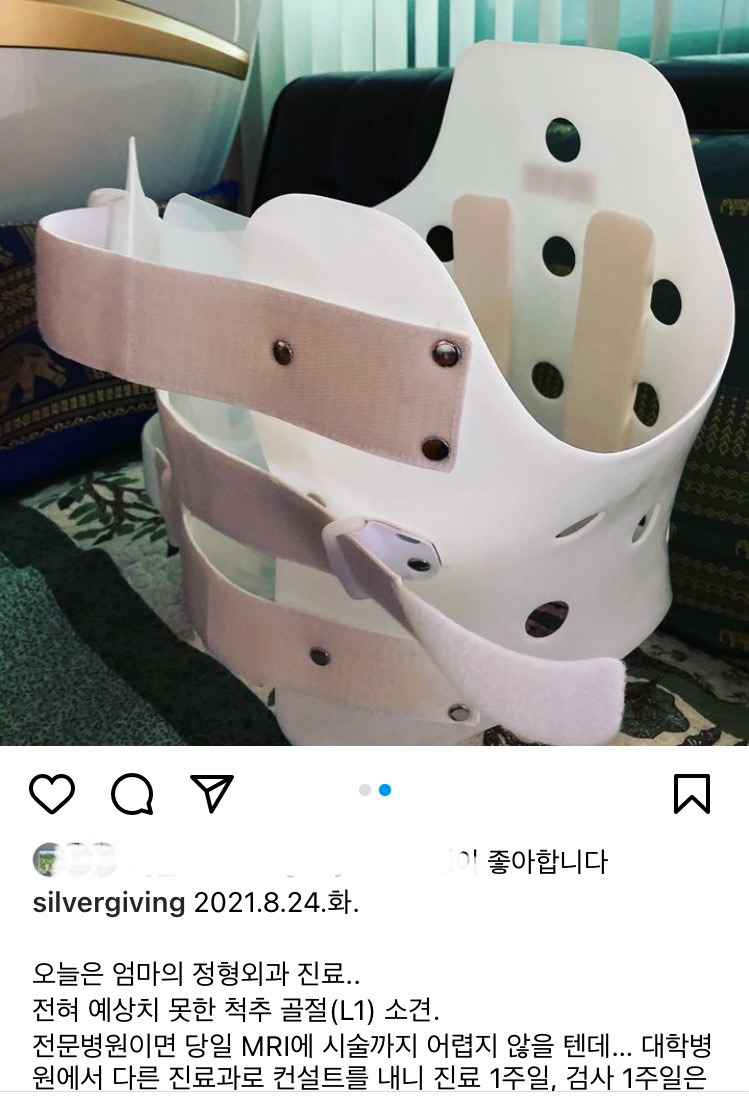 척추와 요추 골절 진단을 받고는 입원 치료 대신 통원 치료를 받았다. 사이즈를 측정하며 몸에 맞춘 갑옷 같은 것을 입고 계셔야 했다. 석고 깁스는 아니라 탈착이 가능하지만 최대한 움직임을 적게 하셔야 했고, 집에서도 주무실 때를 제외하고는 내내 착용을 하셨다.