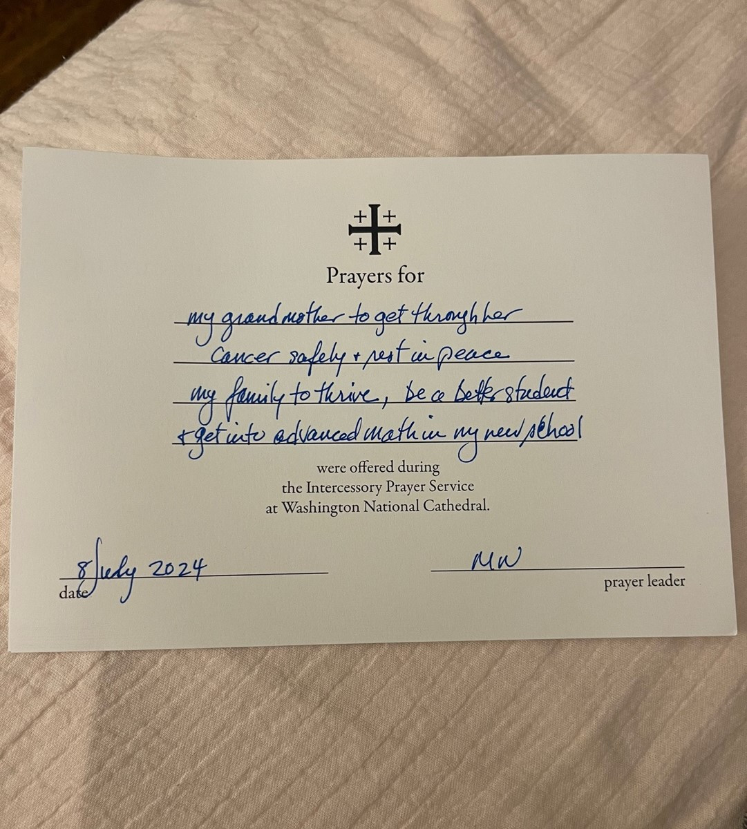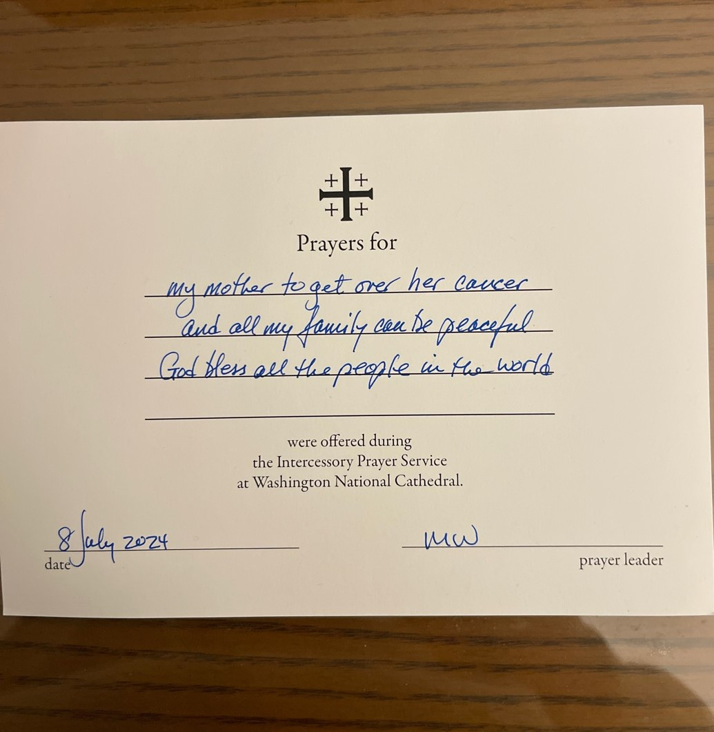 - 네. 제가 할머니 병을 낫게 해 달라고 D.C. 성당에서 기도했는데, 제 기도가 뽑혔어요. 분명 하느님이 기도를 들으셨을 테니 이제 할머니 낫게 해 주실 거예요.
