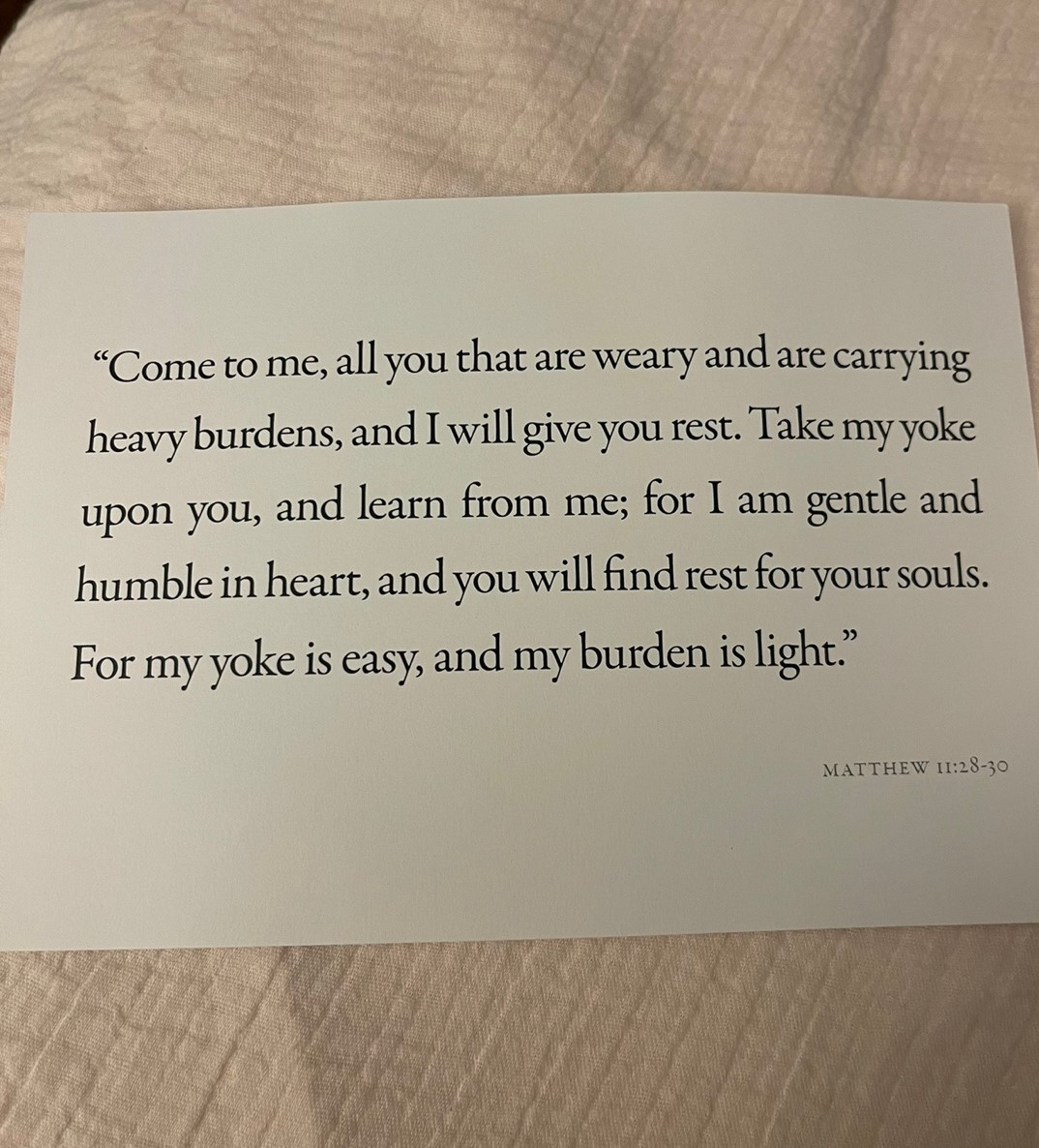 “고생하며 무거운 짐을 진 너희는 모두 나에게 오너라. 내가 너희에게 안식을 주겠다. 나는 마음이 온유하고 겸손하니 내 멍에를 메고 나에게 배워라. 그러면 너희가 안식을 얻을 것이다. 정녕 내 멍에는 편하고 내 짐은 가볍다.”
