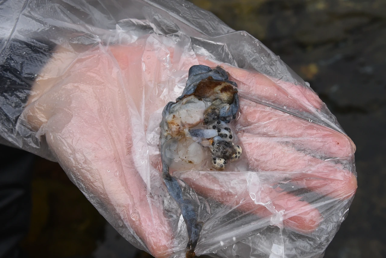 다시 힘을 내어 찾아보았지만 물두꺼비는 더 나타나지 않았다. 그런데 죽어서 상당히 부패가 진행된 물두꺼비 사체가 근처에서 나왔다. 이것이 무슨 일이지 의아해하고 있는데 강의 상류 쪽에서 물두꺼비 사체가 엄청 많이 있다고 소리쳤다. 얼른 달려가 확인하니 물 안에 여기저기 하얀 조각들이 있는데 모두 물두꺼비 사체였다. 심지어 알이 아직 그대로 있는 사체도 있었다. 우리는 모두 어쩔 줄 모르고 있는데, 바로 4-50 m 상류에 새로 지은 교각이 보였다. 그리고 하천 바로 옆에 아스팔트를 새로 포장하고 있었다. 혹시 이 교각 공사 때문에 물두꺼비가 몰살당했나? 아마일은 곰팡이병 때문에 단체로 죽었을 수도 있다고 방금 채집한 물두꺼비 피부에서 표면 샘플을 채취했다. 물론 곰팡이병이 가능성이 없는 것은 아니지만, 물두꺼비의 몰살과 새로 지은 교각의 연관성을 쉽게 떨칠 수가 없었다. 양서류는 피부로도 호흡을 할 수 있기 때문에 피부를 통해 외부의 독소와 같은 물질이 쉽게 통과할 수 있다. 그래서 비슷한 조건이면 물속의 양서류가 어류 보다 교란에 더 민감하게 반응할 수 있다. 물두꺼비가 몰살당한 이유는 정확히 규명할 순 없었지만, 우리는 암컷 물두꺼비가 내년 봄에 짝을 찾고 성공적으로 산란하기를 바라면서 풀어 주었다.