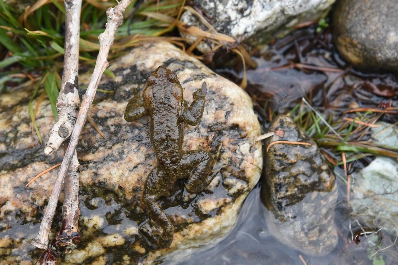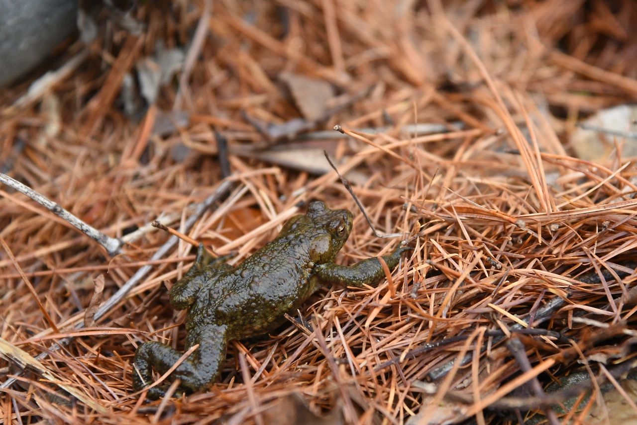 우리가 처음 탐사한 장소는 물두꺼비가 월동 하기에 적합해 보이지 않아서 새로운 장소로 이동하였다. 이 장소는 성무성 군이 몇 년 전에 물두꺼비를 잡은 곳이었다. 이번에는 확실히 보겠지 기대하고, 우리는 바위를 들쳐보고 족대를 쑤셔댔다. 아마일 군은 물두꺼비 서식지 특성을 조사하려고 유속이나 강의 바닥 재질 등을 열심히 기록했다. 그러나 우리의 기대와는 달리 물두꺼비는 나타나지 않았다. 점심시간이 가까워지고, 우리는 지쳐가기 시작했다. 그때 역시 성무성 군이 물두꺼비를 잡았다고 소리를 쳤다. 우리는 바로 달려가 물두꺼비를 처음 대면했다. 월동 중이었는지 움직임이 전혀 없고, 눈도 감겨 있는 암컷이었다. 갑자기 배고픔도 사라지고 다시 힘을 내서 찾기 시작했다. 지금은 국립생물자원관에 근무하시는 이정현 박사님이 대학원생일 당시 지도교수님인 박대식 교수님과 같이 발표한 논문에 따르면 암컷 물두꺼비는 월동 할 때 홀로 있는 경우는 없고, 항상 포접을 하고 있다. 이것은 일종의 짝지키기이다. 양서류는 월동에서 깨어나면 제일 먼저 짝짓기와 산란을 한다. 그러므로 암컷과 같이 월동 하면 이듬해 짝짓기 할 때 유리하다. 이상하게도 오늘 발견한 물두꺼비 암컷은 포접도 하지 않았고, 근처에 다른 물두꺼비도 찾을 수 없었다.