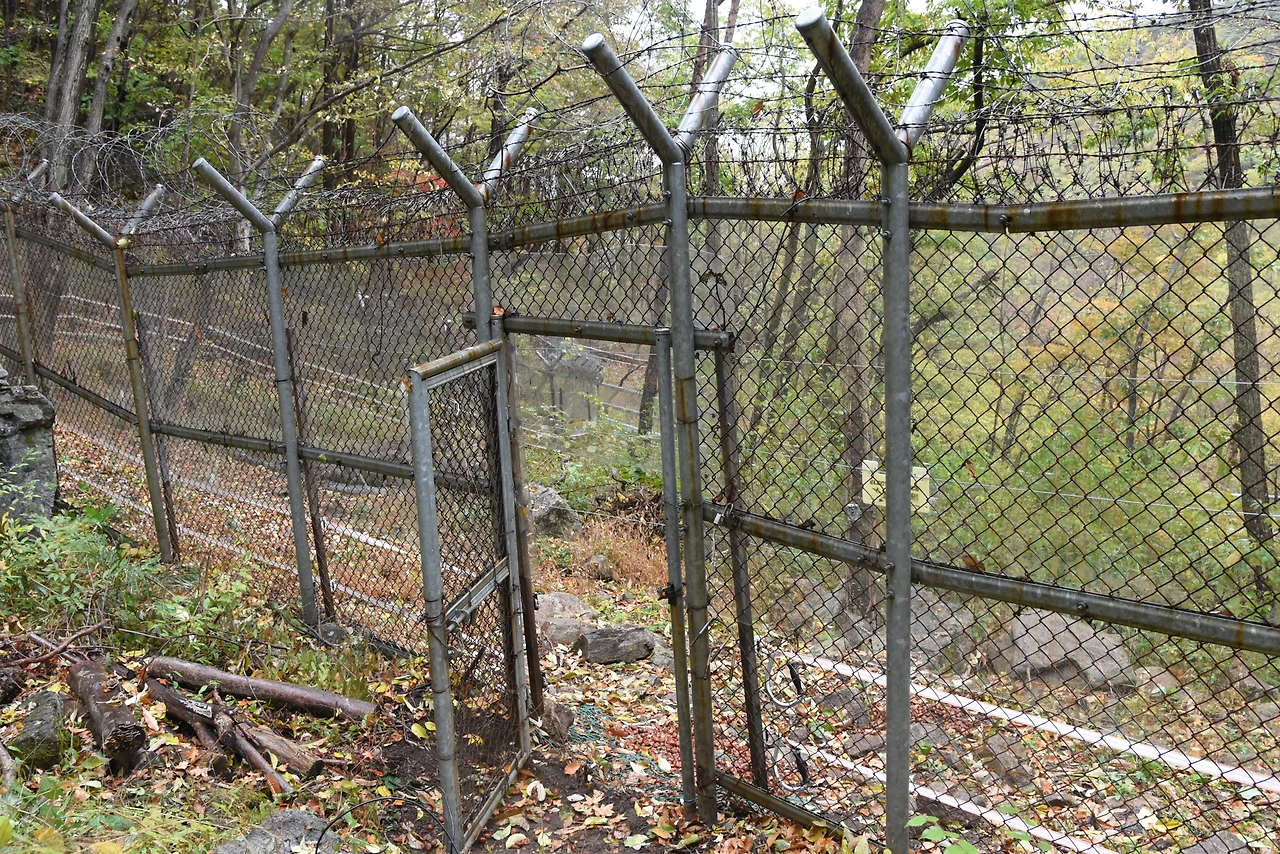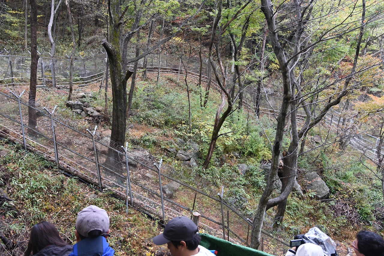 반달가슴곰 자연적응훈련장에서 새끼 곰들이 나가기를 기다리는 연구원과 취재진. 아쉽게도 새끼 곰들이 이 휸련장이 나가는 모습을 볼 수는 없었다.