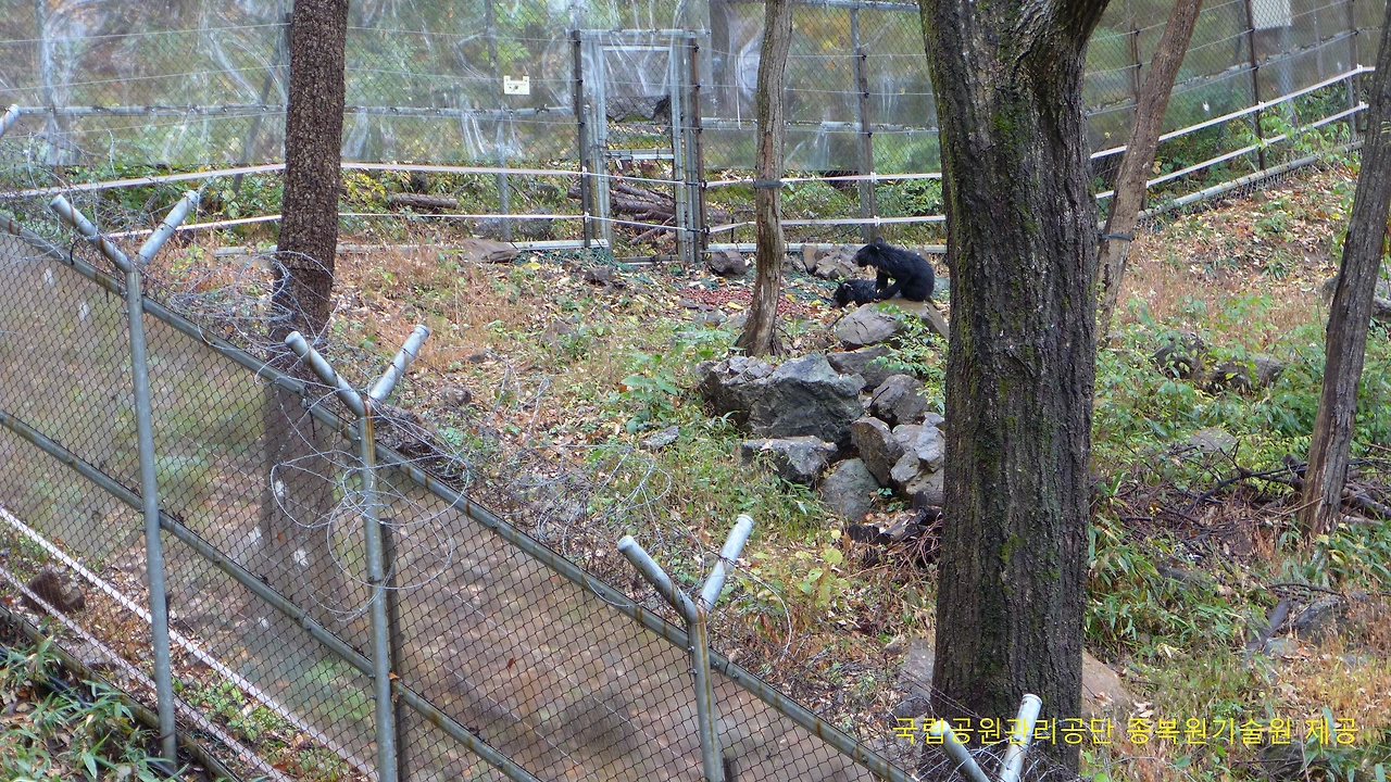 2015년 10월 27일 방사하기 직전의 반달가슴곰 새끼 두 마리. 이들은 9월부터 어미와 분리되어 자연적응훈련장에서 야생적응훈련을 받고 있었다. (사진: 국립공원관리공단 종복원기술원 제공)