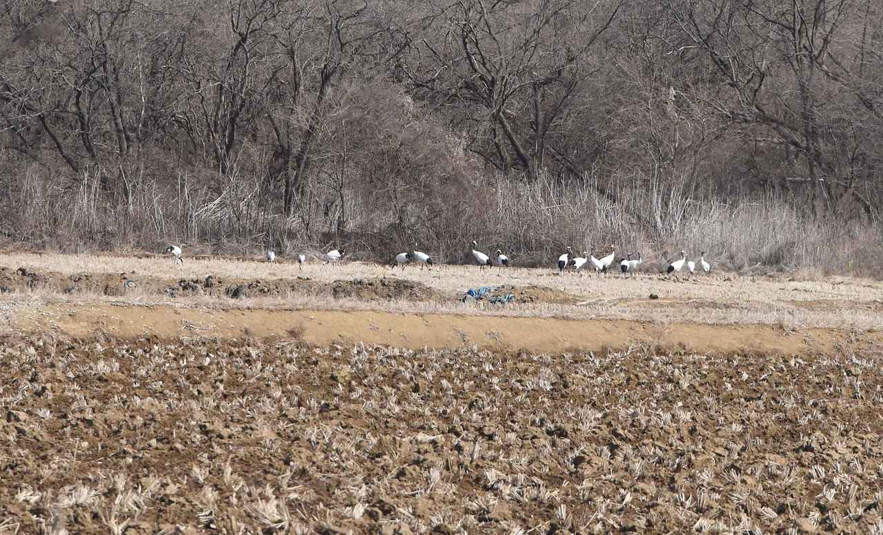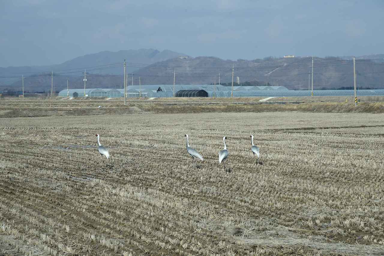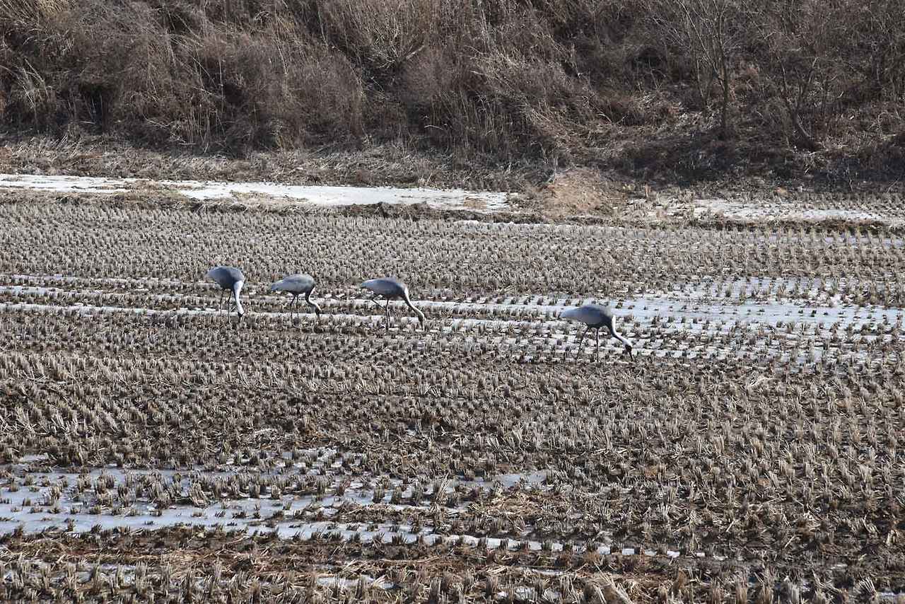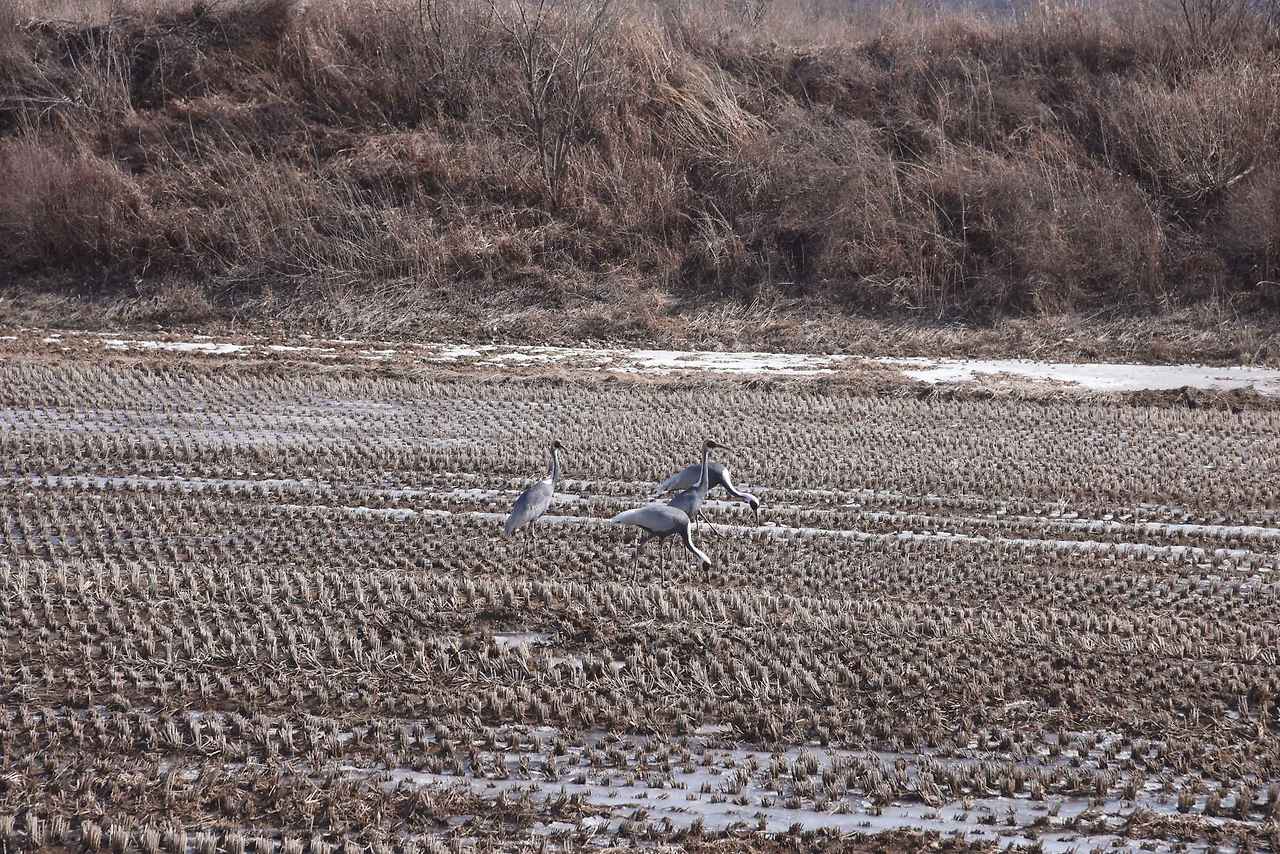 이 날은 하늘이 맑고 추웠다. 우리는 논에서 먹이를 찾고 있는 두루미를 내려다볼 수 있었다. 철원에는 몸이 회색을 띤 재두루미와 하얀색의 흰두루미가 월동한다. 그런데 서너 마리씩의 무리도 있고, 수 십 마리의 무리도 있었다. 김 박사님은 수 십 마리의 재두루미 무리가 일본 가고시마현의 이즈미에서 와서 기착하고 있다고 알려 주었다. 이들은 철원에서 먹이로 체력도 보충하고, 구애도 하며 시베리아로 다시 이주할 때까지 시간을 보낸다.