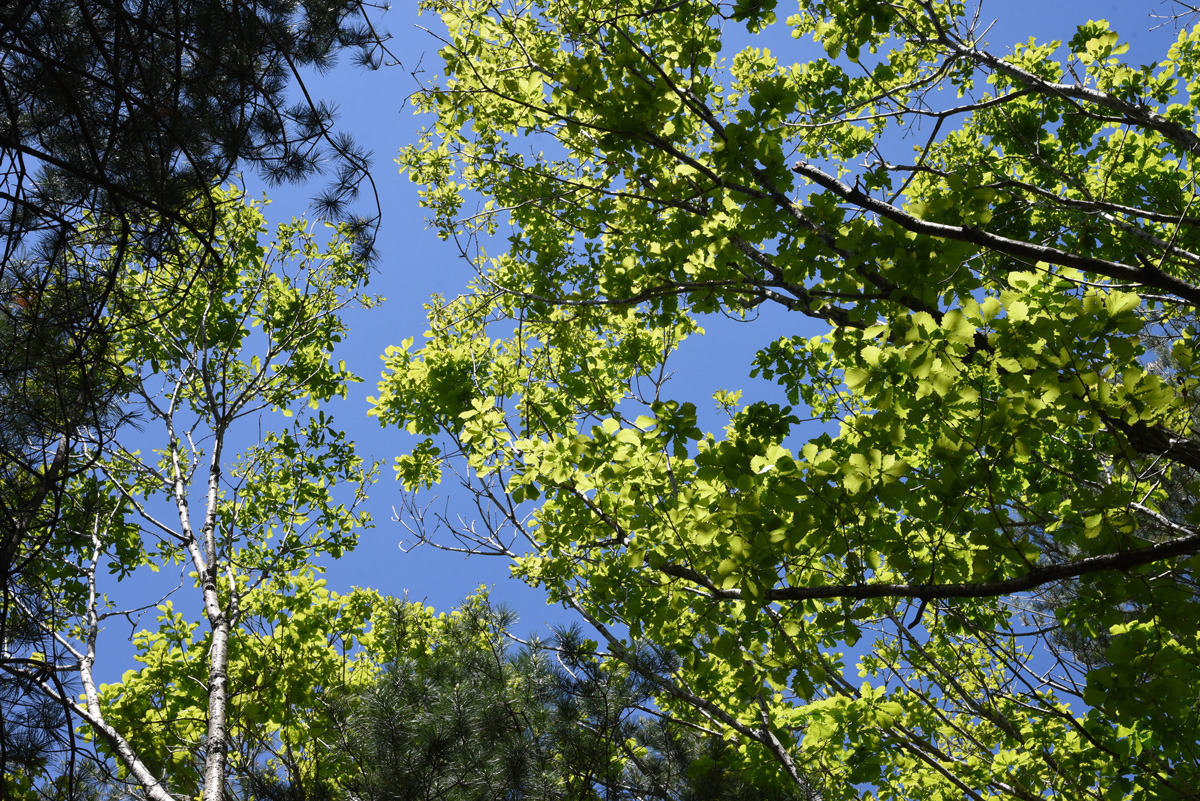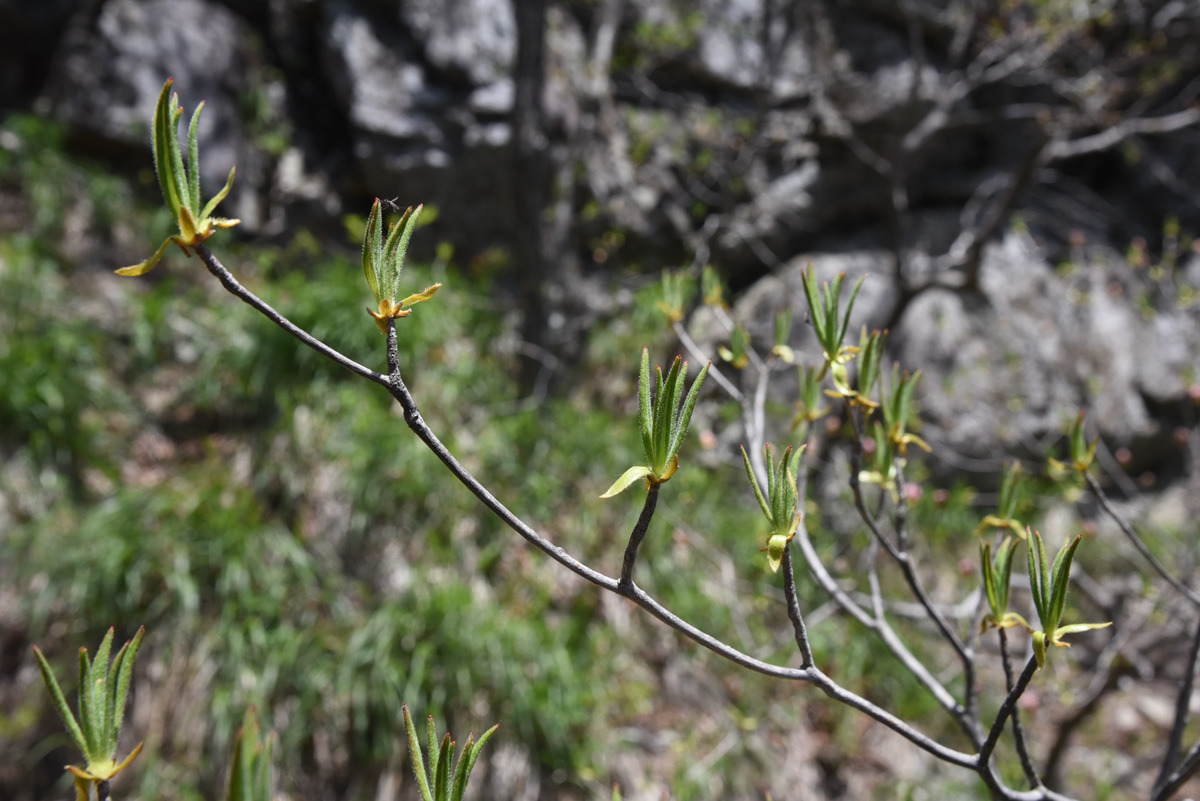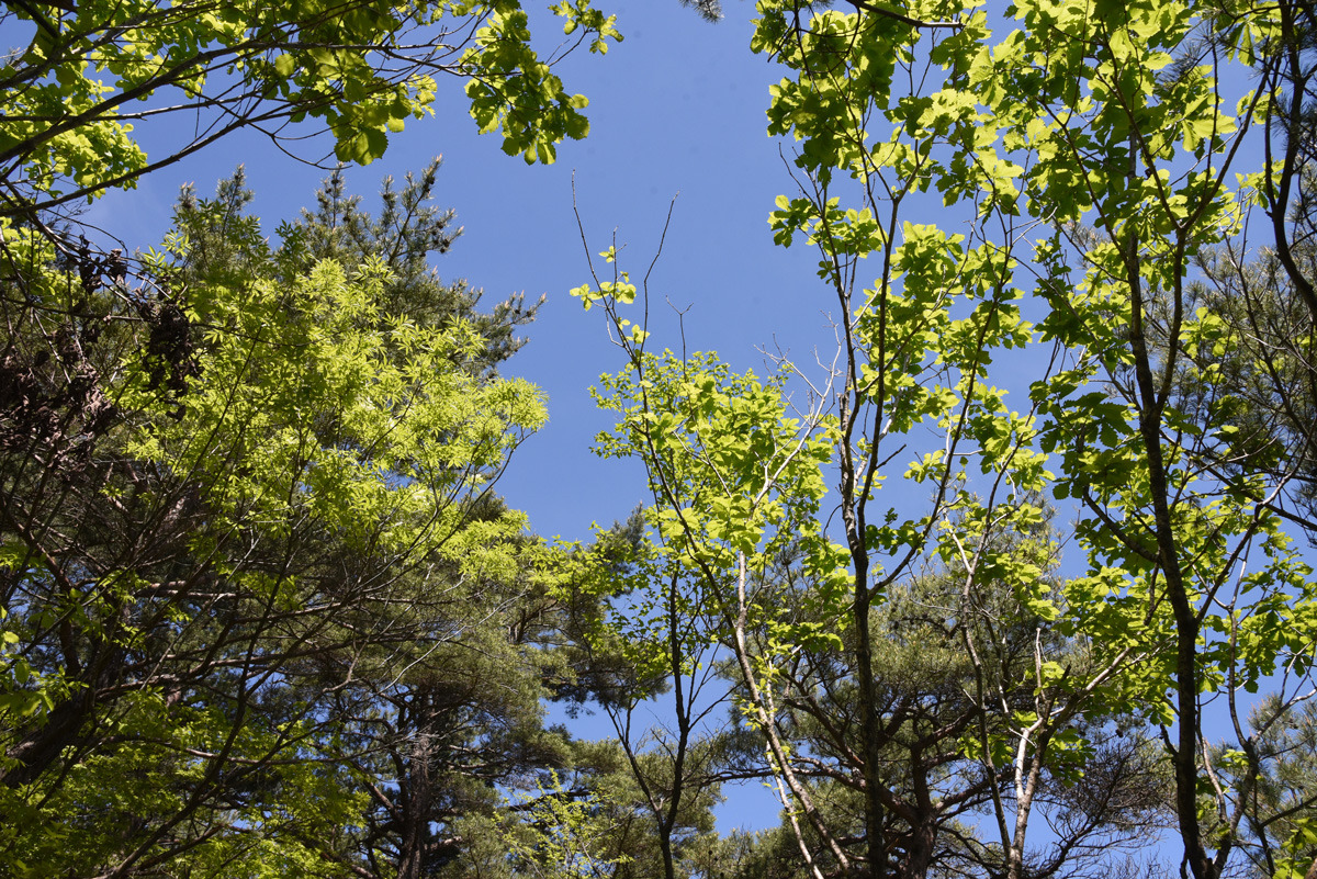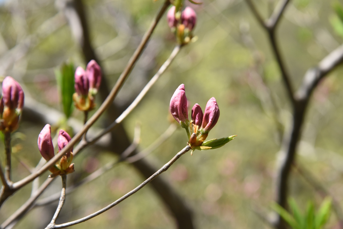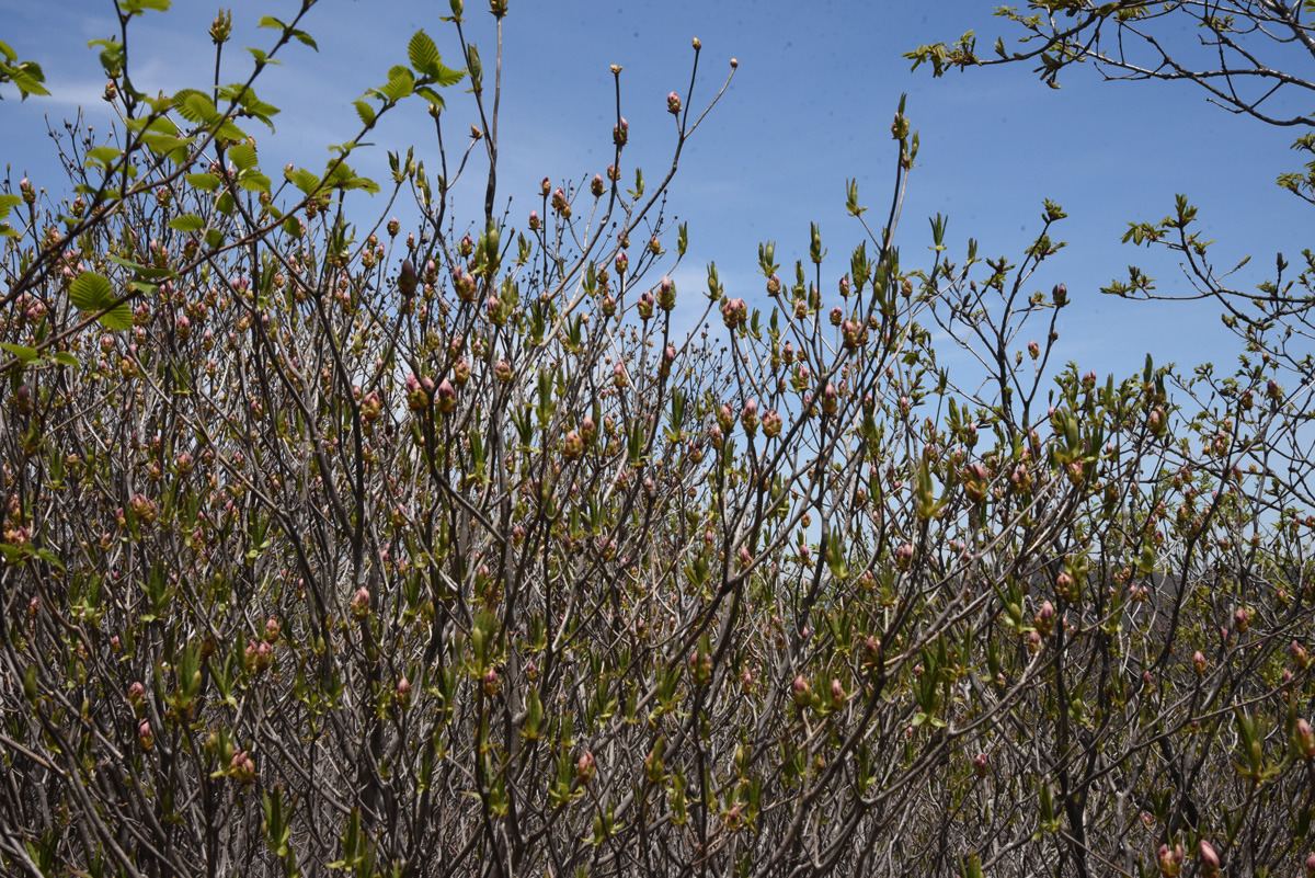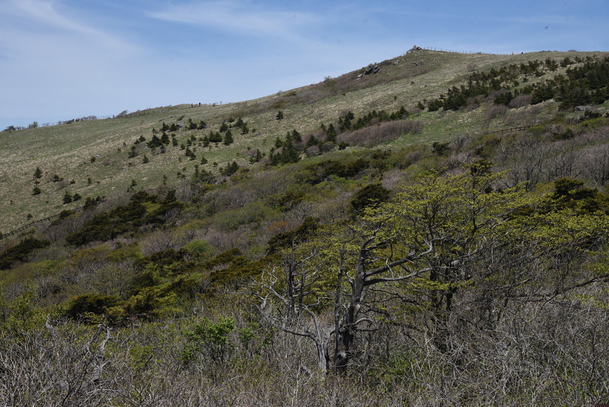 고도가 1200-1300 m에 이르자 드디어 철쭉 군락이 나타났다. 그러나 이곳의 철쭉은 새순만 나와 있고, 아직 꽃망울은 나오지 않았다. 개화하려면 2주 정도 더 기다려야 한다. 신갈나무도 이제 새잎이 돋고 있었다. 전망이 좋은 곳에서 내려다보니 개엽 정도에 따라 소백산이 뚜렷하게 색으로 구분된다. 고도가 낮은 지역은 이미 개엽이 끝나고 잎이 성숙하여 진한 녹색이다. 그 위에는 밝은 연두색으로 이제 개엽이 막 마무리되는 중이다. 그리고 지금 서 있는 곳은 아직 회색이 많다. 아직도 여기는 봄이 오지 않았나 보다.