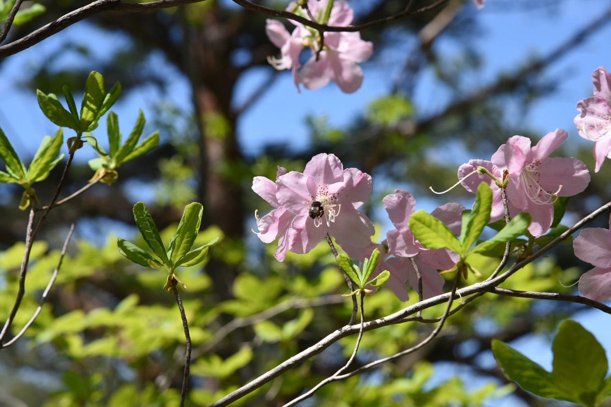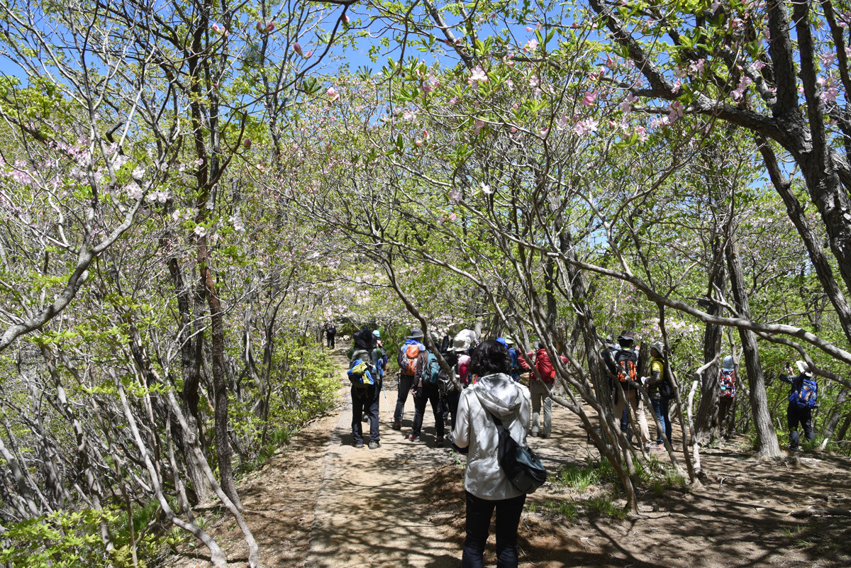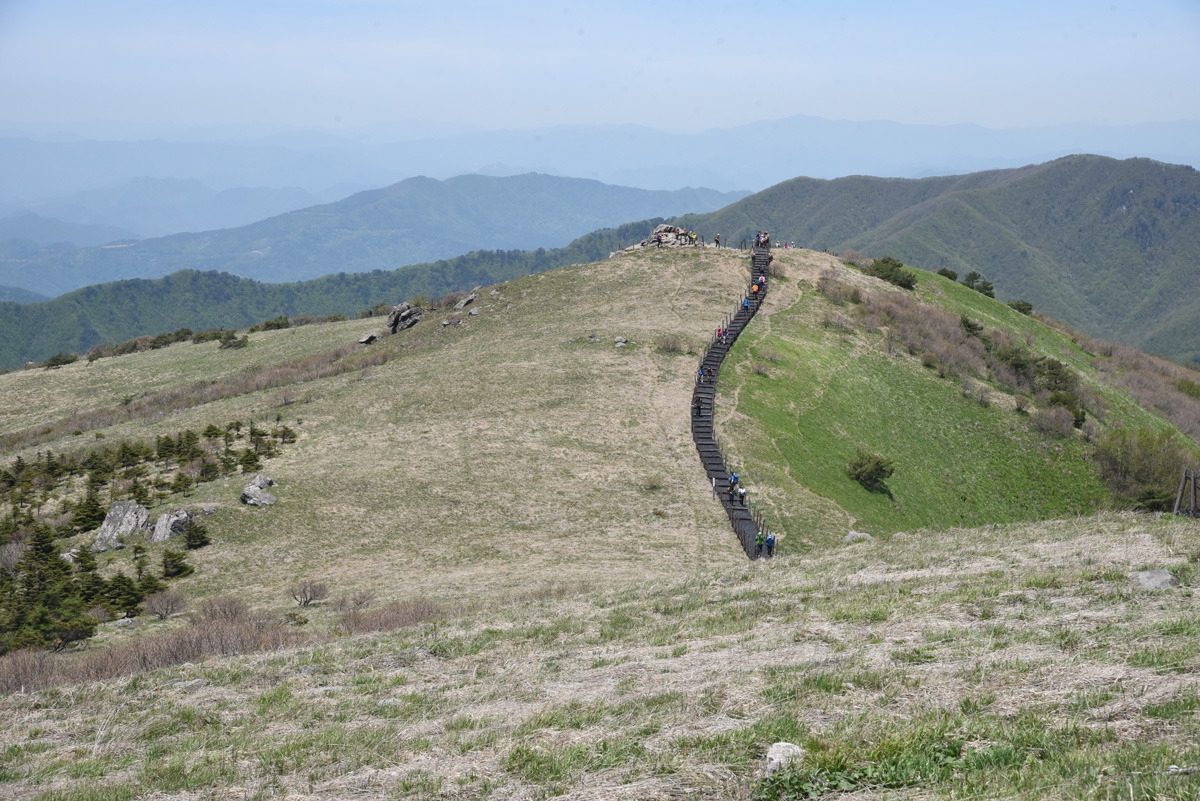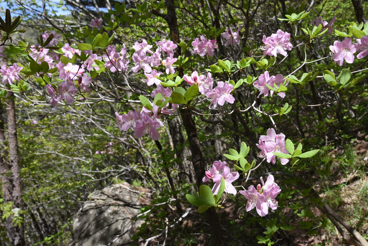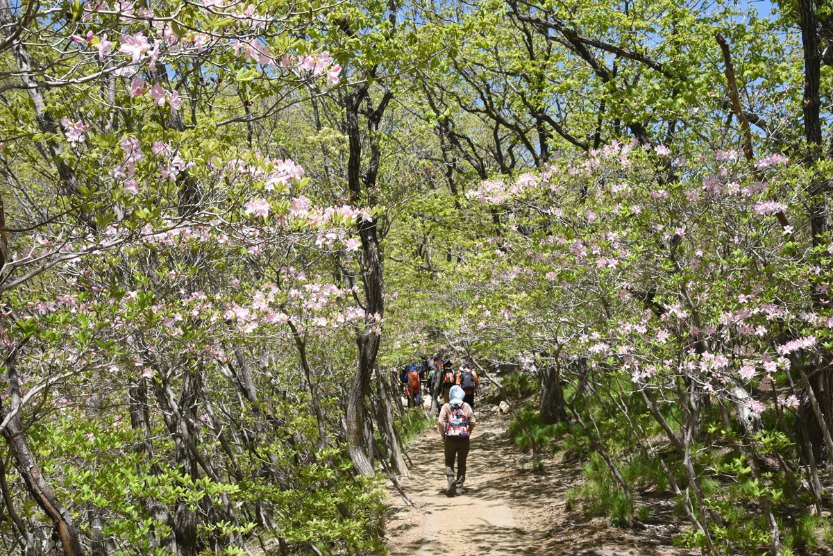 고도가 1000 m 근처에 이르자 철쭉꽃들이 만발해 있다. 도시에서 보기 힘든 유난히 파란 하늘을 배경 삼아 이제 개엽한 신갈나무의 연두색 잎과 연분홍의 철쭉꽃이 어우러져 우리 옆으로 위로 지나갔다. 길 양쪽의 철쭉꽃들이 아치를 만들고 있고, 우리는 그 사이로 통과했다. 곧 아치는 사진 찍는 사람들로 인산인해를 이뤄 통과하기도 어렵다.