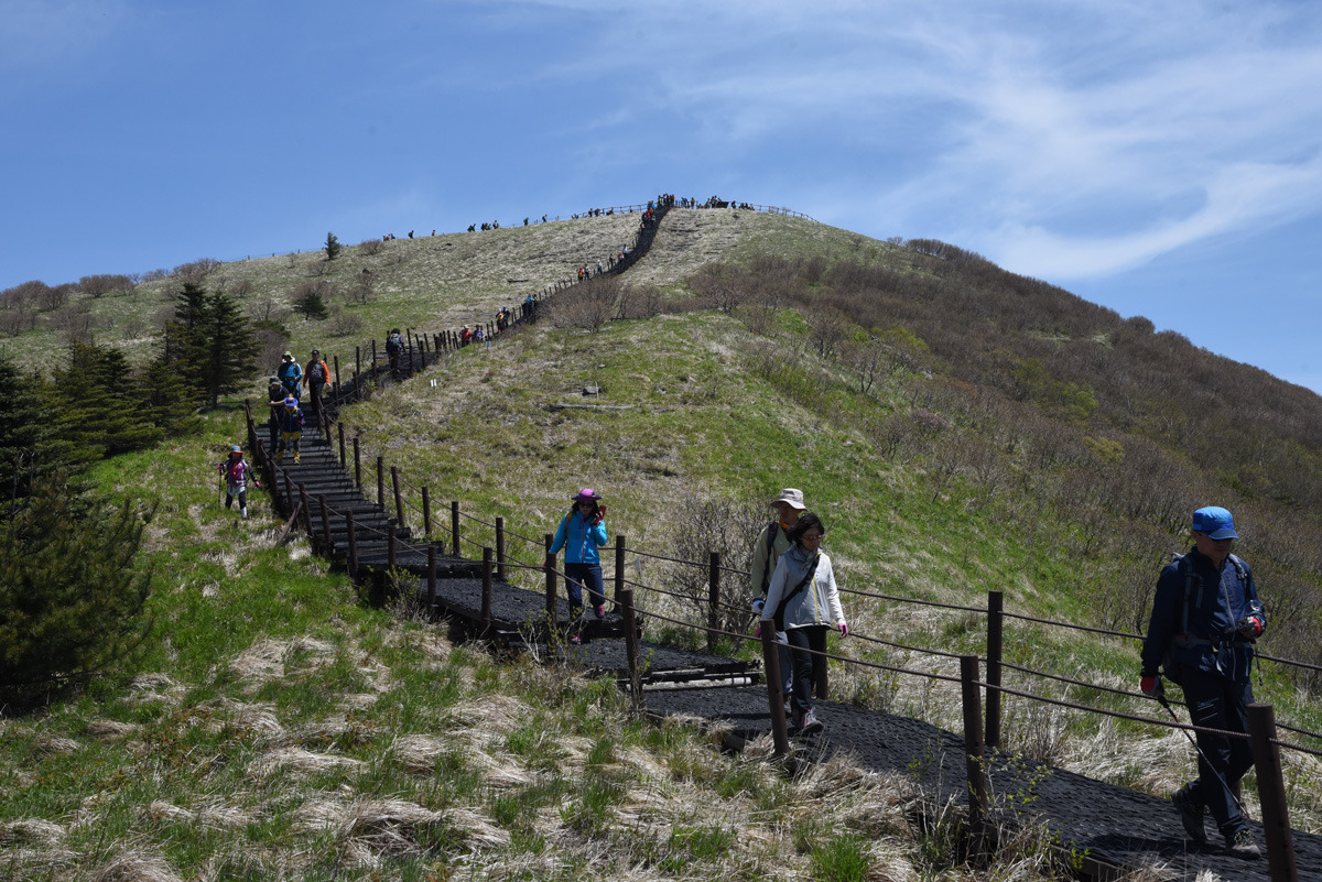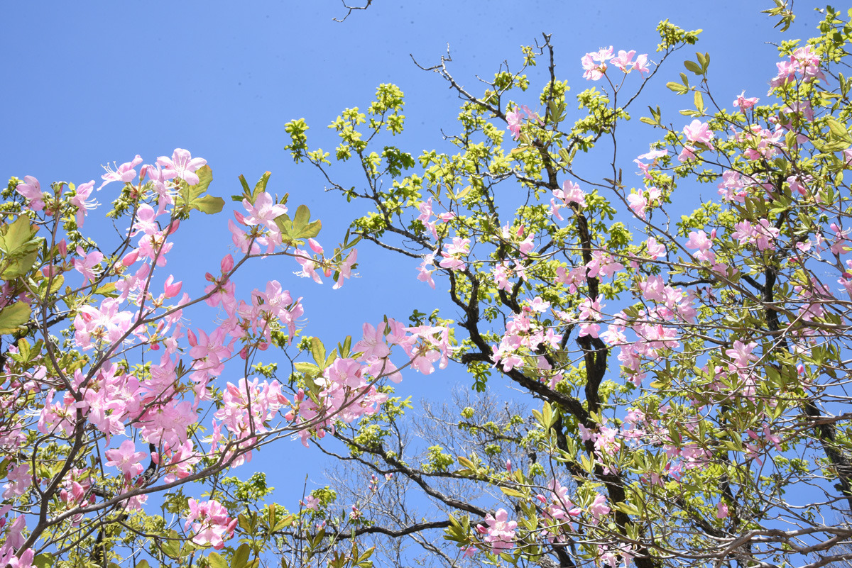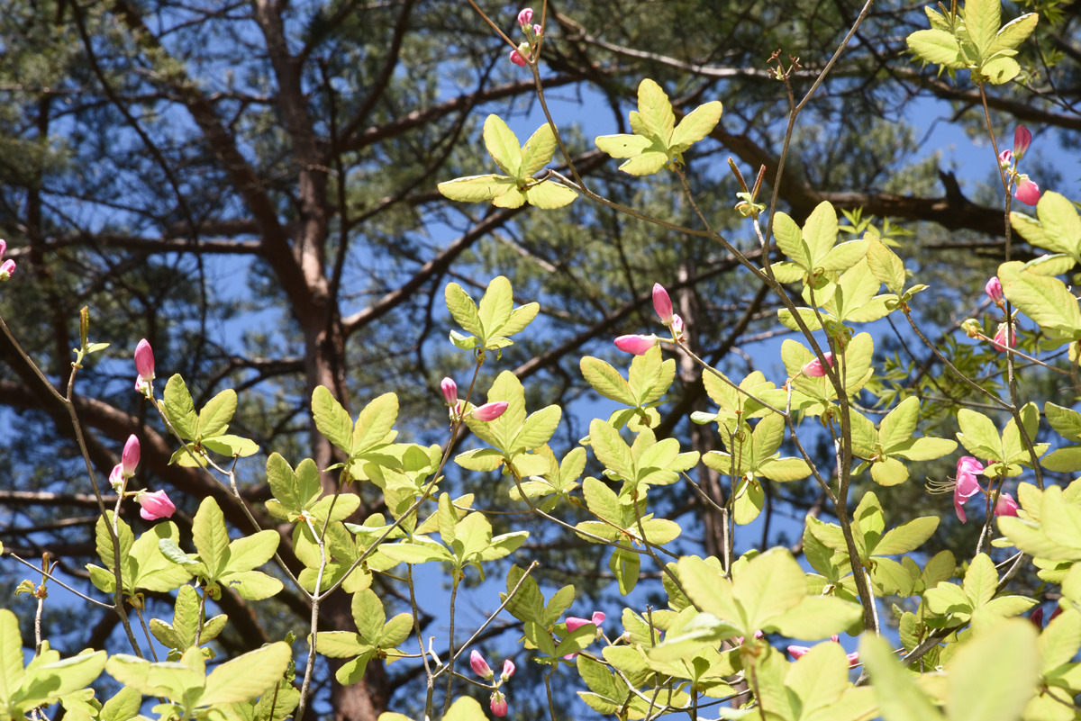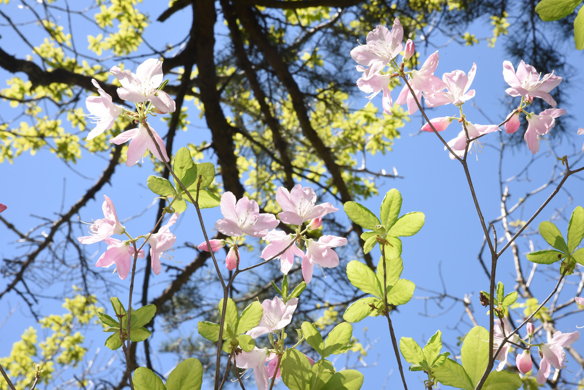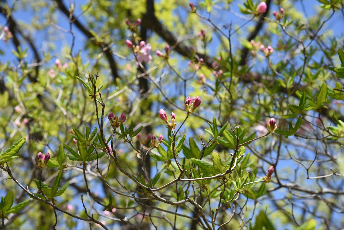 고도가 1000 m 근처에 이르자 철쭉꽃들이 만발해 있다. 도시에서 보기 힘든 유난히 파란 하늘을 배경 삼아 이제 개엽한 신갈나무의 연두색 잎과 연분홍의 철쭉꽃이 어우러져 우리 옆으로 위로 지나갔다. 길 양쪽의 철쭉꽃들이 아치를 만들고 있고, 우리는 그 사이로 통과했다. 곧 아치는 사진 찍는 사람들로 인산인해를 이뤄 통과하기도 어렵다.