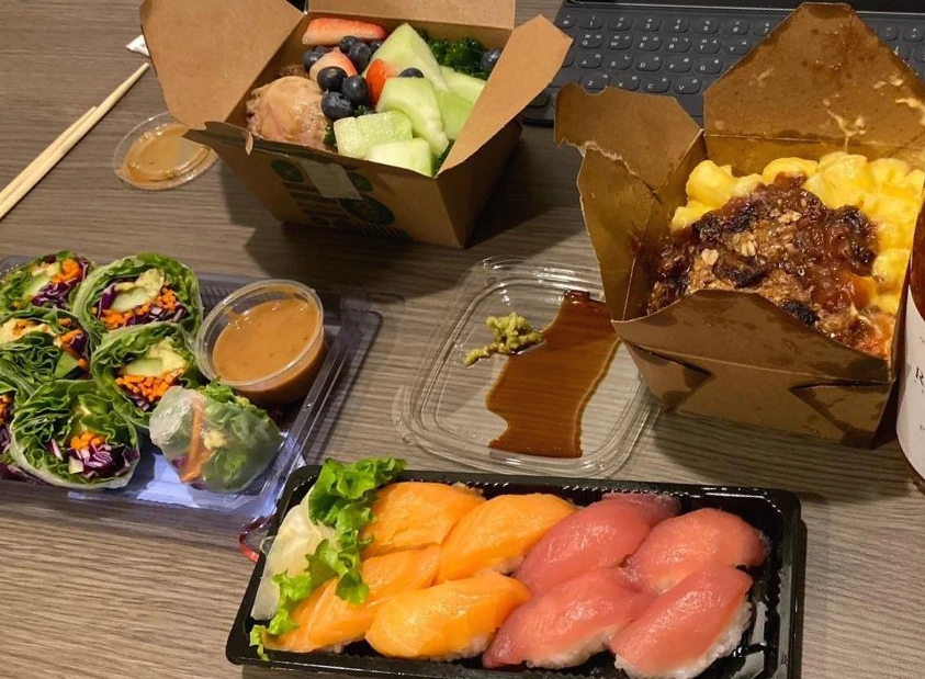 샐러드 박스를 마음대로 담을 수 있는 코너가 있었다. 박스 모양으로 된 일회용 용기에 샐러드나 간단한 요리를 마음대로 조합하여 담을 수 있었다. 우리는 채소 샐러드, 파스타, 치킨 등 정말 다양한 음식을 마음껏 담았다. 두 박스를 구매했다. 함께 먹을 음료와 초밥도 함께 샀다.
