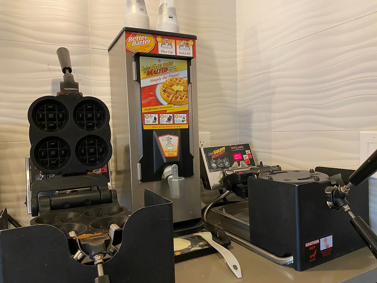바로 즉석에서 와플을 만들어 먹을 수 있는 기계였다. 가운데 정수기처럼 생긴 곳에 플라스틱 용기를 가져다 대고 반죽을 담는다. 그 반죽을 좌우에 있는 와플 팬에 잘 부어 뚜껑을 닫으면 그만이다. 뚜껑을 닫은 뒤에 와플 팬을 180도 돌리면 자동으로 타이머가 시작된다. 길지 않은 시간이 지나고 타이머가 끝나면 바로 맛있는 와플이 완성되는 것이다. 취향에 맞게 버터나 메이플 시럽을 뿌려 먹으면 이보다 더 든든한 식사가 또 있을까.