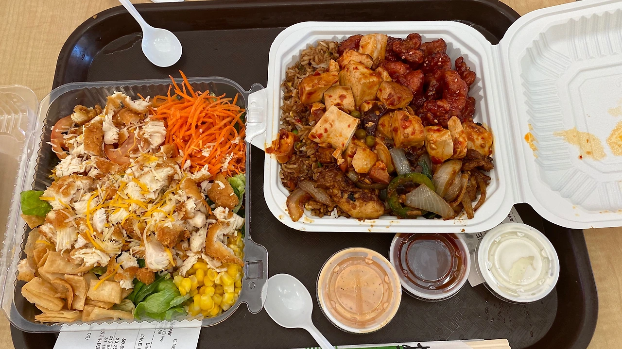 뭐 살 만한 것이 있는지를 둘러보기 전에, 얼른 점심을 먹어야 했다. 벌써 시간이 많이 늦어 배가 엄청나게 고팠기 때문이다. 아웃렛 내부에 위치한 식당가를 찾았다. 다양한 식당들이 여러 가지 나라의 메뉴를 팔고 있었다. 나는 꼭 먹어보고 싶었던 '미국식' 중국요리를 선택했다. 볶음밥을 기본으로 그 위에 치킨, 마파두부, 야채볶음 등의 메뉴를 선택하여 올릴 수 있는데 그 양이 굉장히 푸짐하다. 친구는 치킨 샐러드를 주문했다. 같이 곁들여 나누어 먹을 생각으로 주문했는데, 역시나 샐러드만 둘이 나누어 먹어도 배가 부를 만큼 양이 많았다.