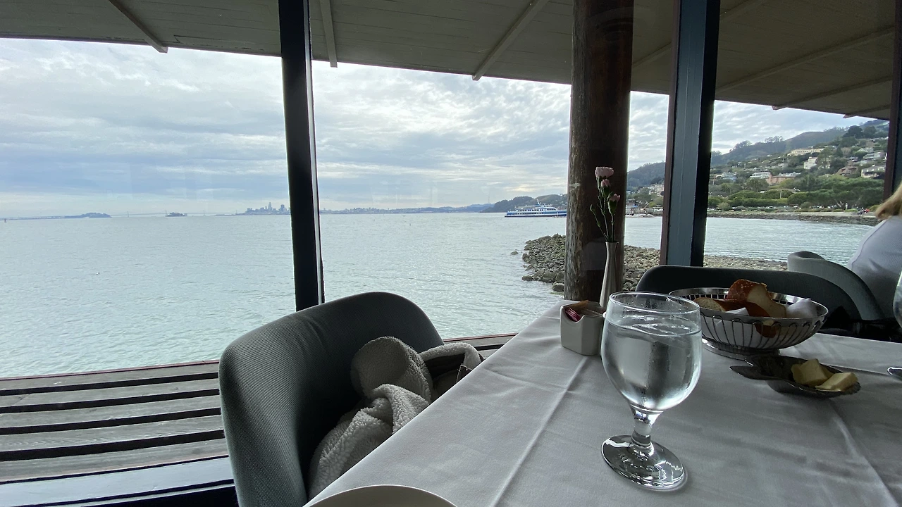 생각보다 격식 있는 레스토랑이었다. 가격대도 조금 높은 편이었으나 바로 자리를 안내받기로 했다. 큰 통유리로 보이는 바깥 경치에 이미 유혹을 당했기 때문이다. 큰 유리를 통해 소살리토의 아기자기한 주택 가득한 언덕 모습이 한눈에 들어왔다. 그리고 넓은 바다 건너편 샌프란시스코의 빌딩 숲도 함께 보였다. 때때로 사람들을 태운 유람선이 오고 가는 모습도 보였고, 갈매기를 비롯한 여러 이름 모를 새들도 물과 하늘을 오가며 열심히 돌아다녔다.