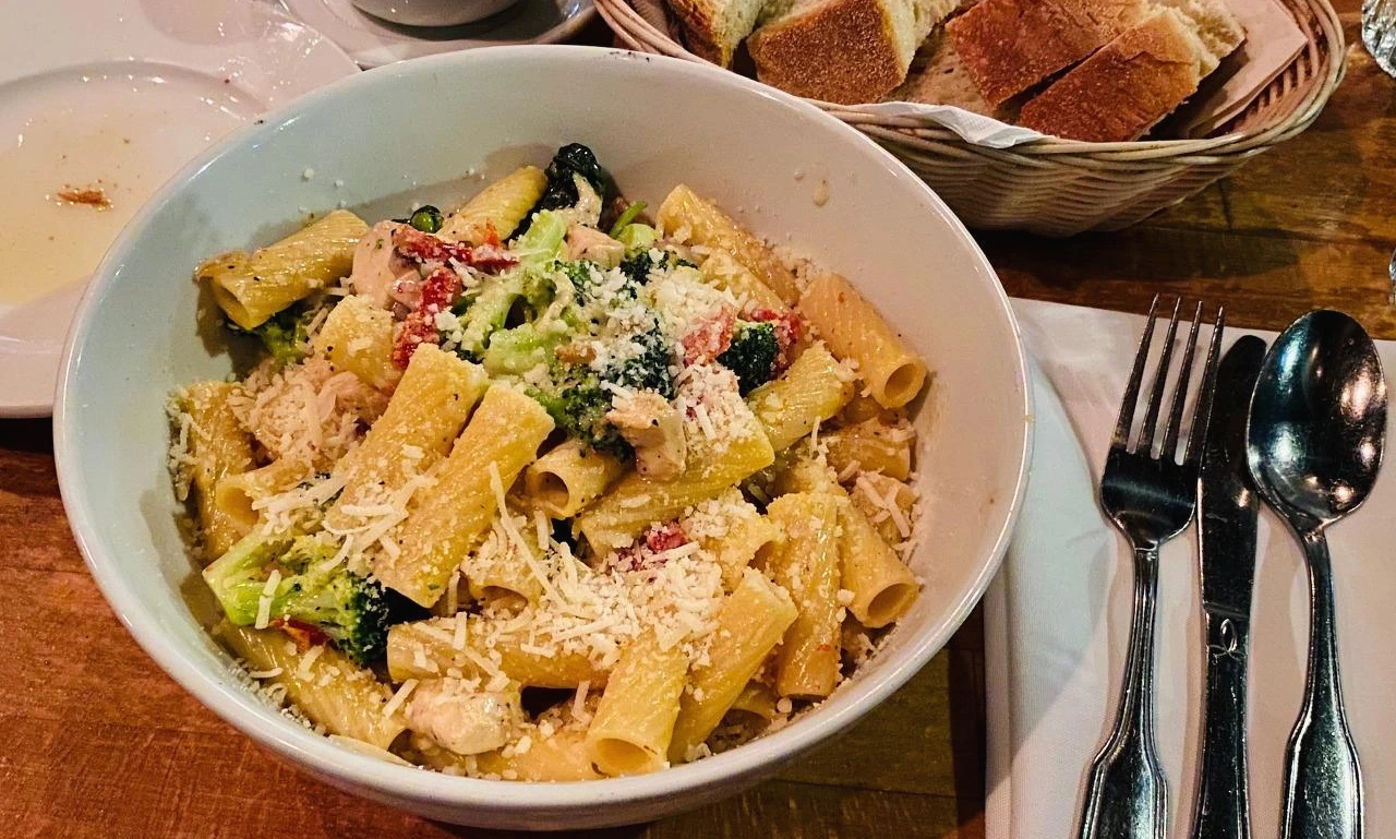 친구가 시킨 크림 파스타도 나왔다. 생각했던 생김새와는 조금 달랐다. 크림이 흥건한 파스타를 예상했었는데 파스타 샐러드 같은 느낌의 음식이었다. 그럼에도 맛은 크림이 한가득 있는 것처럼 풍부하고 고소했다. 사진에서는 양이 그리 많지 않아 보이는데, 그릇의 크기와 깊이가 정말 어마어마했다. 열심히 먹는다고 먹었는데 우리 둘 모두 반 정도를 먹고는 더 이상 먹기를 포기했다. 정말 맛있는 음식을 앞에 두고도 배가 불러 더 이상 먹지 못했다.