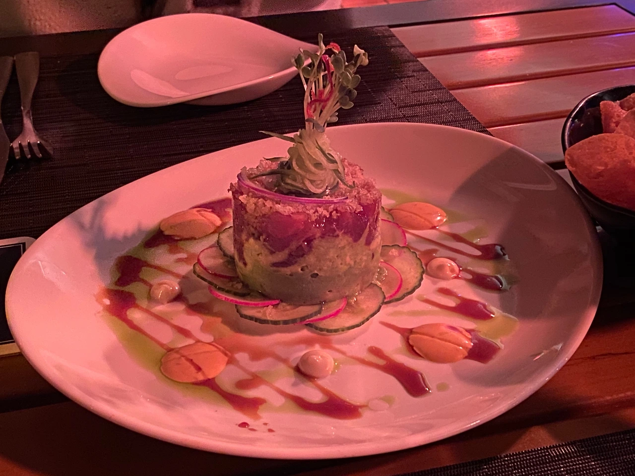 처음으로 주문해서 서빙된 음식은 '튜나 포케 타워'다. 말 그대로 참치회 샐러드로 만든 탑이다. 참치는 역시 부드럽고 신선했다. 아보카도와 튀김 조각들 사이에 끼인 참치를 잘 잘라 아래 뿌려진 소스와 함께 먹으면 달달하면서도 고소하고 짭짤하면서도 상큼한 맛을 느낄 수 있다. 나초와 같은 모양을 한 생선 과자를 함께 주는데 여기에 참치 샐러드를 올려 먹으면 정말 최상의 조합이다. 생선 과자는 마치 새우깡 맛이 나는데, 나중에 참치회랑 새우과자를 함께 먹어봐야겠다는 생각을 잠깐 하기도 했다.