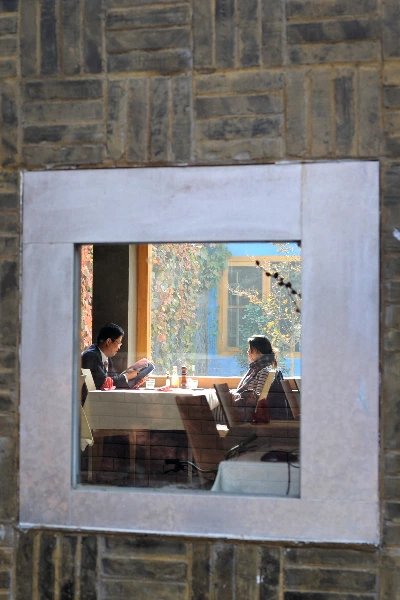 카페의 연인. 북경에선 흔치 않은 정장을 입은 남성과 마주 앉은 여성의 두꺼운 머플러가 눈에 띄었다. 창 너머 중정의 풍경이 무척이나 예뻤다.