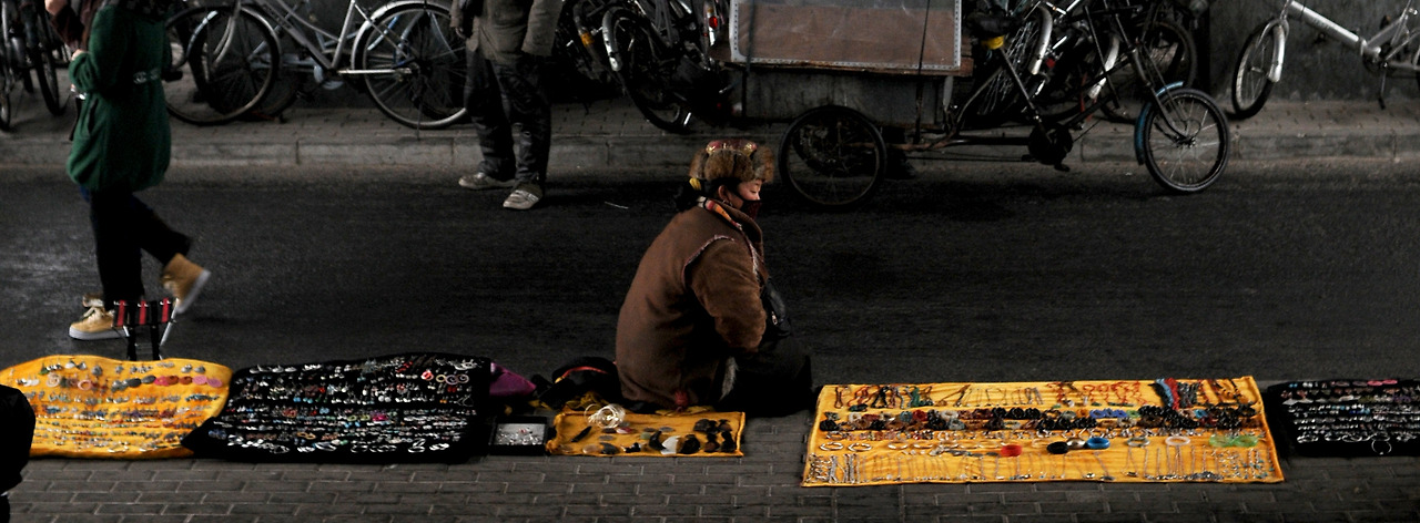 북경 내 유명 대학들이 몰려있는 오도구의 지하철역 주변 인도에 티벳족 여인이 좌판을 펼쳤다. 정부의 정책으로 이주된 한족들에 의해 밀려난 그들은 고향을 떠나 대도시로 흩어지며 그들만의 정체성도 희미해지는 중이다.