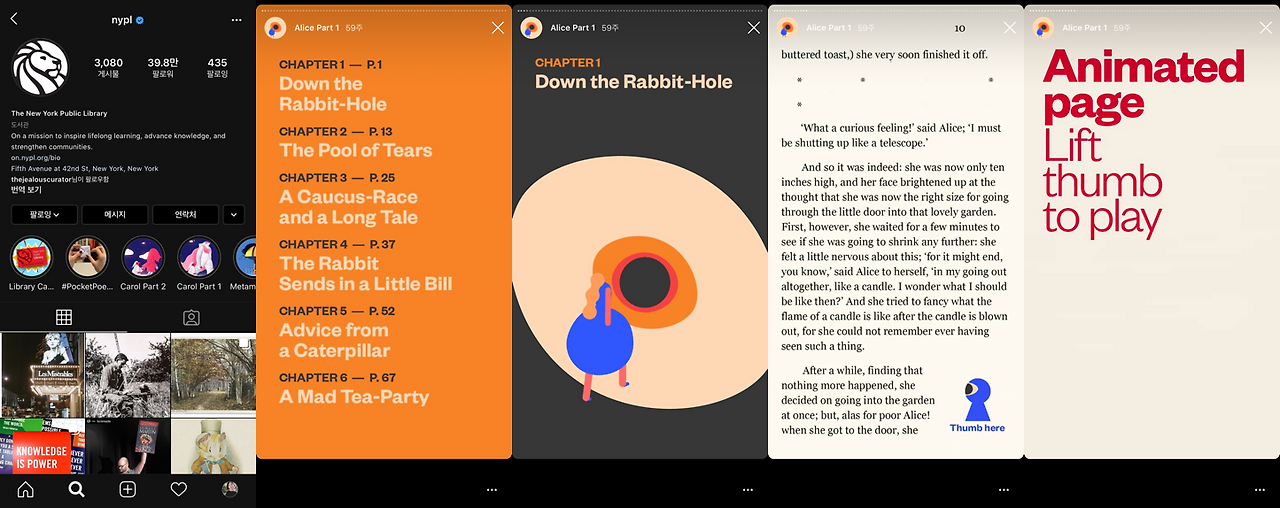 이들은 팔로워들이 인스타그램의 스토리 기능을 활용하여 책을 읽을 수 있게 만들었는데, 단순히 텍스트만 넣은게 아니라 애니메이션과 이미지를 적절히 활용하여 디지털 세대에 맞춰진 텍스트 컨텐츠를 제공하였다. 인스타그램에서 많이 볼 수 있는 인스턴트식, 홍보용 ‘피드’보다는 ‘도서관’이라는 특성에 맞춘 ‘컨텐츠’를 제공하였다는 점에서 의미있는 시도였다.