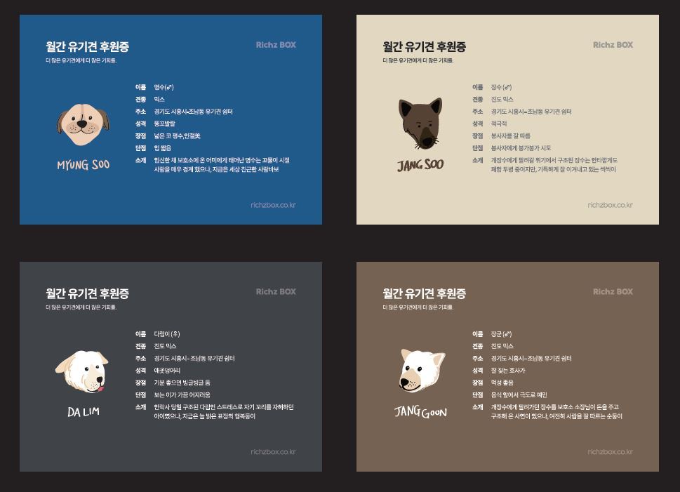 A4. 그렇습니다. 이건 후원자로서 제 결핍이 가장 많이 반영된 결과물입니다. 8년 가까이 유기견 보호 단체에 꾸준히 기부하며, ‘결제 문자’ 외에 그 어떤 피드백도 받아본 적 없었는데 그 부분이 참 아쉬웠습니다. 실제로 주변에서도 좋은 마음으로 후원을 시작했다가 생각보다 쉽게 중단하는 걸 종종 봐오며, 원인이 뭘까 생각했는데, 가장 큰 이유가 눈에 보이지 않아서인 것 같았습니다. 물론 리치즈박스가 비영리 단체도 아니지만, 우리가 하는 후원 활동은 뭐든지 눈에 보였으면 좋겠다고 생각했습니다. 우리 고객들은 매월 받아보는 후원증을 통해 본인의 착한 소비의 결과물을 남길 수 있고, 후원증에는 후원 받고 있는 보호소의 유기견의 이름과 소개가 포함되어 있어 이 아이들의 존재도 많은 사람에게 알릴 수 있어 긍정적인 측면이 있는 것 같습니다.