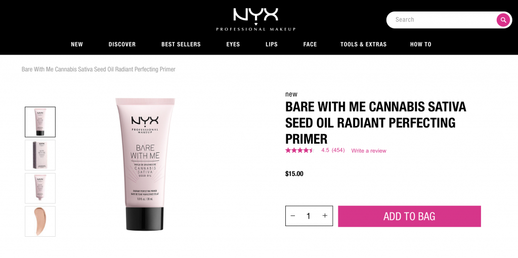 글로벌 색조 브랜드 NYX Cosmetics에서는 최근 새로운 기초 화장품 라인을 런칭했다. 'BARE WITH ME'라는 명칭의 신규 라인은 크림, 립 오일, 아이 브로우 제품으로 구성되어 있으며 프라이밍과 보습 기능에 초점을 둔 라인이다. 해당기능을 소구하기 위해 적용한 성분이 바로 대마에서 유래한 삼씨오일 (Cannabis Sativa Seed Oil)이다. 기존 화장품 브랜드들이 동명의 원료를 함유했을 때 '햄프(Hemp)에서 유래한 원료'로 커뮤니케이션했었던 것에 반해, 해당 제품은 직접적으로 '삼 (Cannabis Sativa)'에서 유래했음을 밝히고 있다. 법적인 규제와 제조 공정 상의 이슈를 고려하여 직접적으로 CBD를 함유하지 않으면서도, CBD에 관심이 있는 소비자들을 사로잡은 사례라 할 수 있겠다.