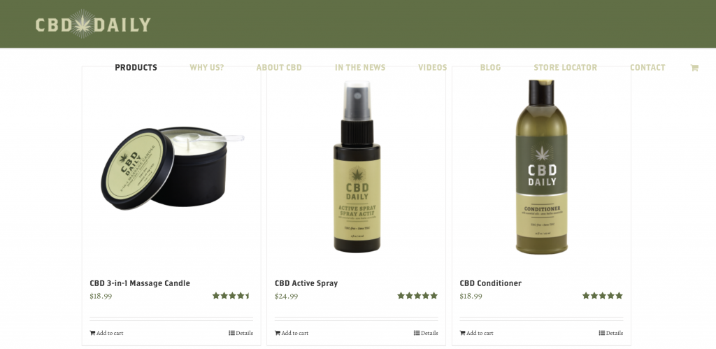 상황이 이렇다보니, 아예 CBD를 메인 성분으로 소구하는 브랜드가 등장하고 있다. 인디 화장품 브랜드 CBD DAILY에서는 CBD를 적용한 다양한 제품을 출시하고 있다. 글로벌 트렌드로 자리잡고 있는 '비건 화장품'을 내세우면서도 CBD라는 특이 성분을 적용하여 차별성을 가져가고 있다. 기본적인 오일, 오일 밤, 마사지 캔들류에서부터 시작해 얼굴 피부에 적용 가능한 로션, 크림에서부터 샴푸, 컨디셔너에 이르기까지 다양한 부위에 사용 가능한 제품을 출시하고 있다.