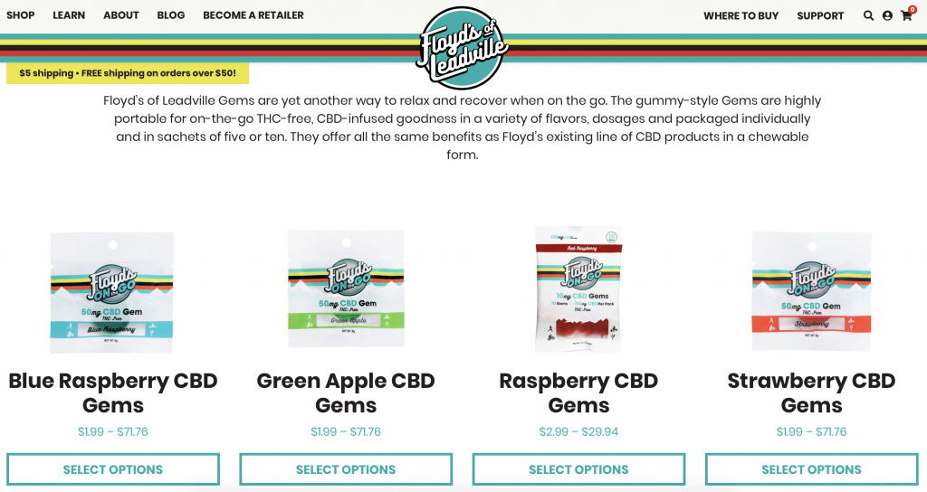 유명 자전거 사이클 선수 플로이드 랜디스가 도핑과 관련된 여러 스캔들을 극복한 후 설립한 기업 Floyd's of Leadville은 CBD 특화 제품을 판매하고 있다. 운동 후 통증을 경감하고 회복을 돕는 CBD 오일류 제품군으로 시작해서 최근에는 보다 간편한 방식으로 CBD를 활용할 수 있는 간식, 간편식 제품군을 선보이고 있다. 가장 최근 출시된 제품으로는 간편하게 섭취할 수 있는 CBD 젤리가 있다. 라즈베리, 애플, 딸기, 블루 라즈베리 맛으로 구분된 상품들은 각각 함유하고 있는 CBD 양이 다르다. 10mg, 50mg으로 구분되어 있어 일반 비타민제처럼 섭취를 원하는 양을 선택하여 구매하면 된다.