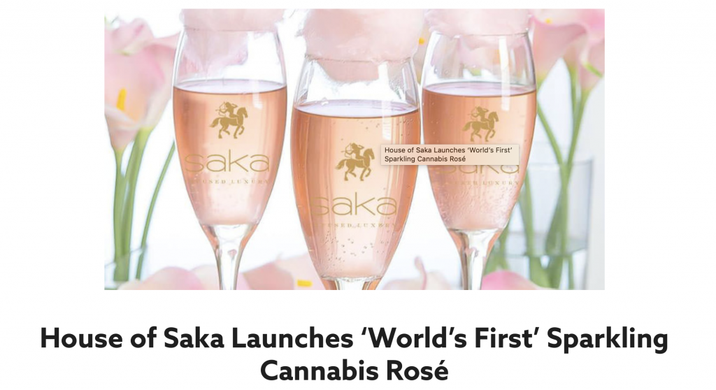 심지어 CBD는 '술' 영역에 진출할 예정이다. 대규모 와인 생산지로 유명한 샌프란시스코 나파 밸리의 한 와이너리에서 실험적인 제품을 내놓을 에정이라고 한다. 럭셔리 와이너리를 지행하는 House of Saka에서는 CBD를 함유한 올해 신규 와인 제품군 출시를 발표했다. 정확히 말하자면 논알콜 스파클링 와인에 CBD와 THC를 배합한 제품이다. 법적으로 CBD, THC류의 성분은 알콜과 함께 배합되는 것이 금지되어 있기 때문에 논알콜 와인에 적용하여 제품이 개발되었다. 술과 대마의 조합, 글자로 봐서는 굉장히 위험한 조합같이 여겨진다. 와인이라는 고급 이미지를 가진 제품군에 CBD 성분을 적용함으로서, CBD 성분의 가치를 높인 한편으로 와인 업계의 시각에서는 젊은 세대를 타겟으로 접근성을 낮추려는 사례로 볼 수 있겠다.