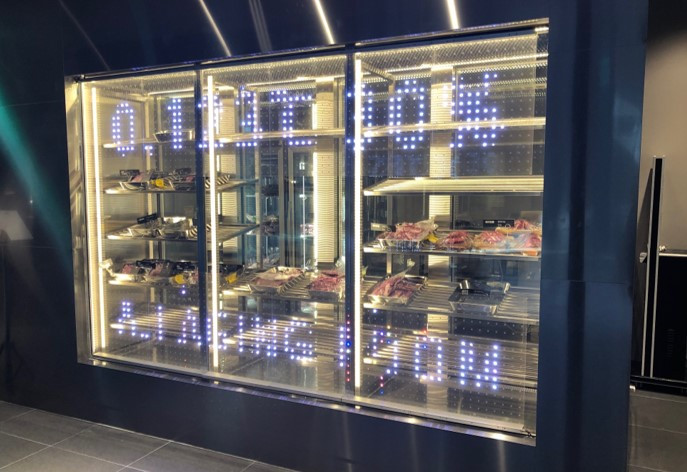 더 맛있는 음식을 제공하기 위해 요즘 핫한 인공지능(AI) 기술을 도입했다. 식당 '산방돼지' 전면에는 전면이 유리로 된 저장고가 있다. 그 안에서는 AI가 고기를 숙성하고, 상추를 기른다.