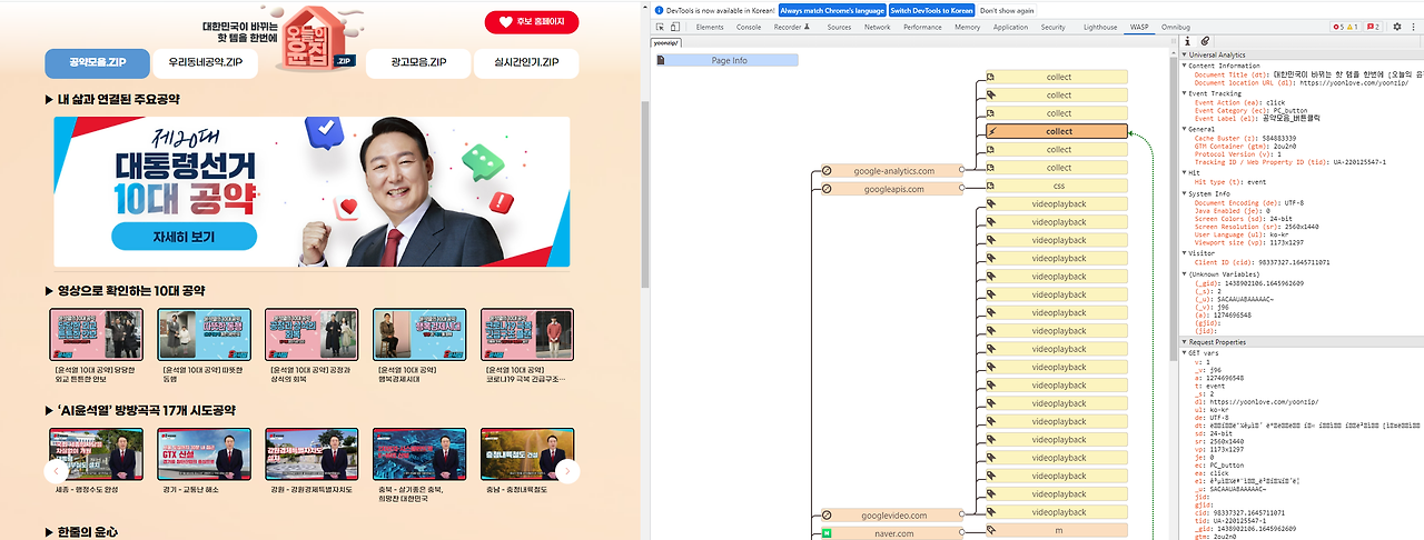 그렇다면 UTM은 아주 세세하게 활용하고 있던 이재명 후보 캠프는 이벤트도 꼼꼼히 세팅해두었을까요? 크롬의 확장 프로그램인 WASP를 통해 확인해보니, 놀랍게도 전혀 흔적이 없었습니다. 광고를 유입되는 숫자와 캠페인 별 성과는 측정하겠지만, 결국 이렇게 되면 전환은 알 수 없게 됩니다. 더군다나 커머스의 구매 같이 정해진 성과가 없기에 더욱 목표를 정의해야 하는데, 이벤트가 없다면 더욱 어려울 수밖에 없습니다.