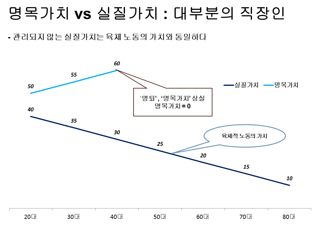 명목가치는 시간에 비례한다. 평균적으로 직장인의 연봉은 시간과 +의 관계를 가지고 있다. 나의 실질가치와는 상관없이 시간이 차면 연봉이 오르고 승진을 한다. 하지만 이 가치는 한 순간 그리고 예고 없이 소멸될 수 있다.