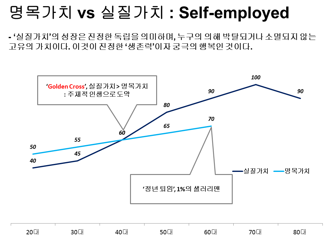 죽음을 맞이하기 전까지 항상 + 또는 =의 방향으로 움직이는 직장인의 명목가치와는 반대로 우리의 실질가치는 (방치된 화초처럼) 너무나도 쉽게 -의 방향으로 흘러간다. 수많은 기업들이 반복적으로 시행하는 '명퇴'란 이벤트도 만연하는 실질가치와 명목가치의 ‘-‘ 차이에 대한 손실을 회복하기 위한 기업이란 생태계의 자정작용이며, 깨어있지 못한 자들의 최후인 것이다. 우리는 자각해야 한다. 자신의 ‘잠재적 가치’가 ‘명목가치’ 대비 '+'를 유지하는 기간 동안 또는 ‘실질가치’와 ‘명목가치’의 '-' 차이가 두드러지지 않는 시간 내에 ‘잠재적 가치’을 ‘실질가치’로 전환시키고 자생할 수 있도록 가꿔야 할 것이다. 우리의 실질가치가 날아오르거나 날아오를 준비가 되었을 때 우리는 ‘명목가치’란 온실을 박차고 나갈 용기와 자신감을 가질 것이다. 우리는 누구나 ‘명목가치’의 벽을 뚫고 올라서는 ‘실질가치’의 'Golden Cross를 만들어내야 할 것이다.