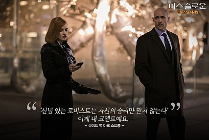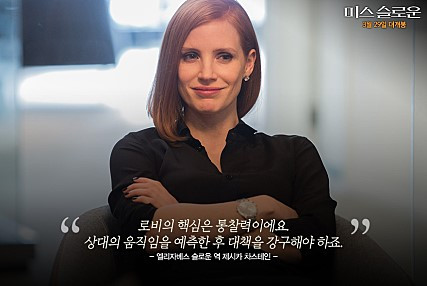 오랜만에 속 시원하고 몰입도 높은 영화를 본 것 같다. ‘미스 슬로운’의 치명적인 매력에 빠져보기를 권한다. 영화 속 인물을 통한 대리만족을 즐기는 분이시라면 강력 추천한다.
