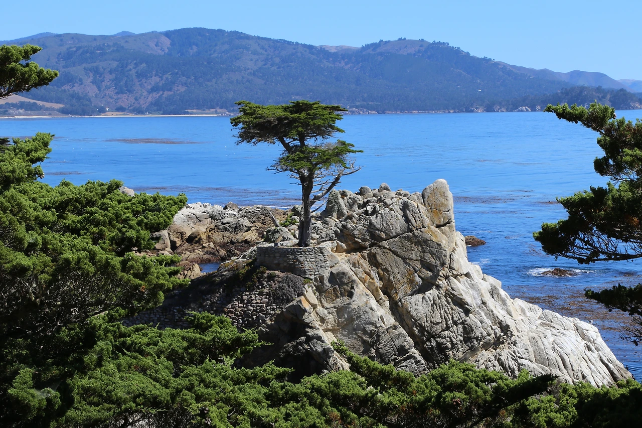 카멜 바이더 시(Carmel by the Sea)에 홀로 서있는 소나무.