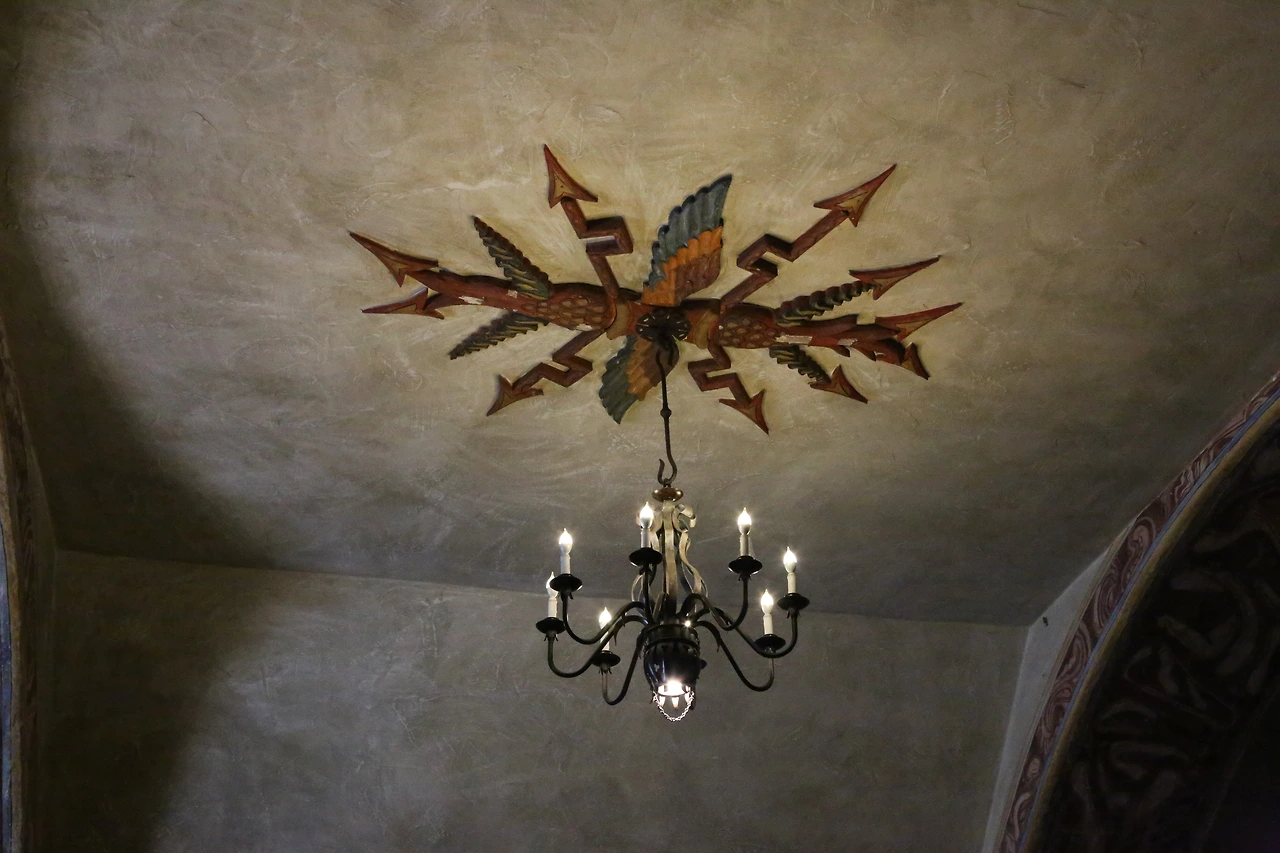 천장의 등은 스페인식이고 그 등을 매달고 있는 장식은 추마쉬 인디언들이 레드우드에 천연염료를 칠해 만든 작품이다.