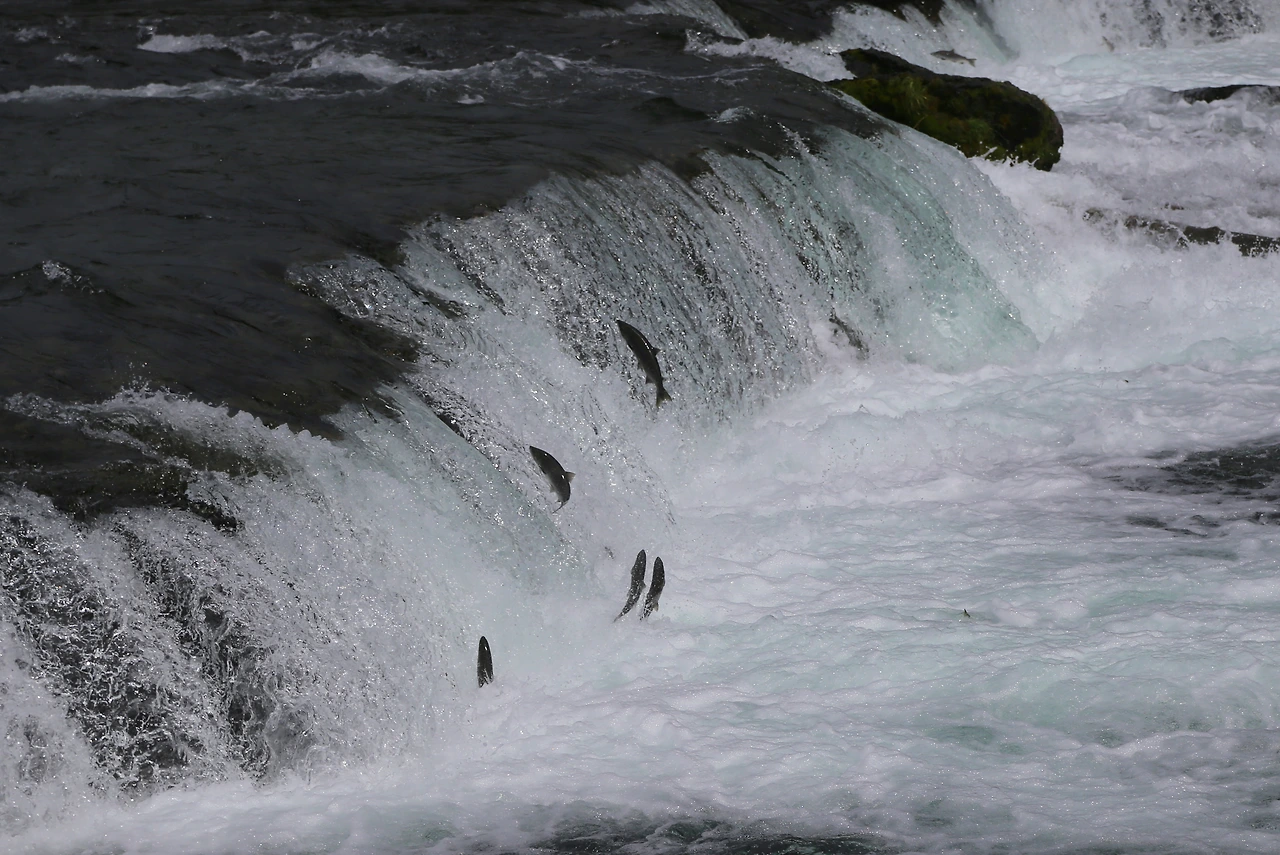 물속에는 이렇게 많은 연어가 태어난 곳으로 가려고 길을 찾는다.