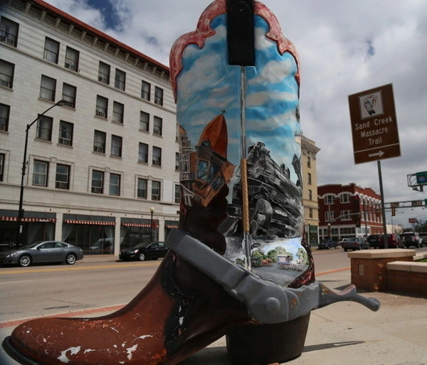 부츠 뒤에 Sand Creek Massacre Trail이라는 간판이 보인다.
