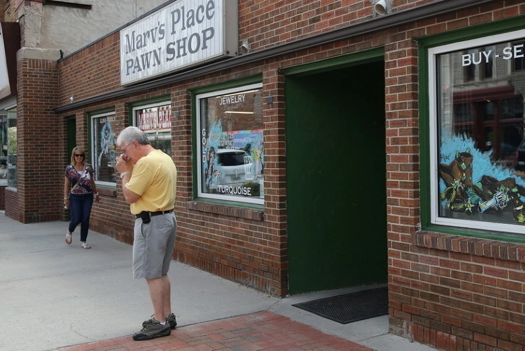 한 남자가 전당포에서 무언가 사 가지고 나와 급하게 확대경으로 들여다본다.