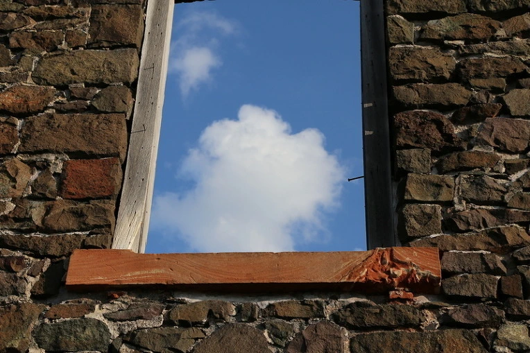 무너진 창으로 파란 하늘이 유난히 맑다.