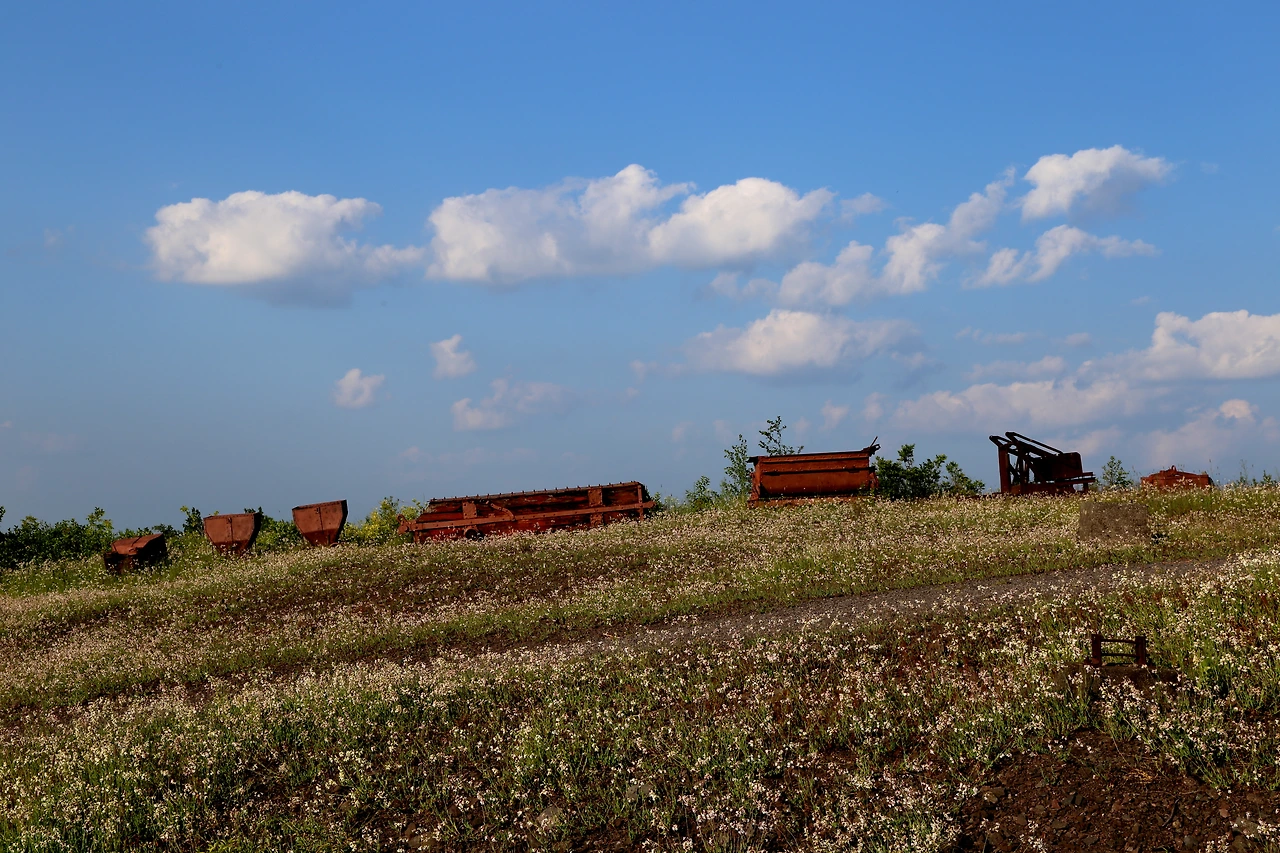 가진 것을 다 내어 준 이 언덕의 폐광에서 오랜 세월 열심히 일한 고철들이 묘지의 비석처럼 줄지어 쉬고 있다.