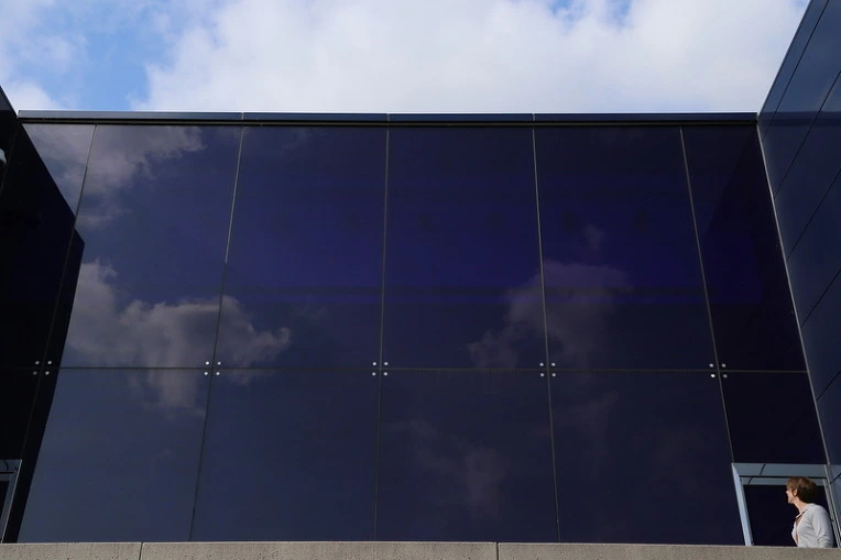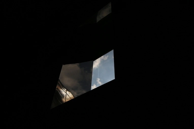 내가 바라보는 유리에 비친 구름을 한 여자가 돌아서서 바라본다.