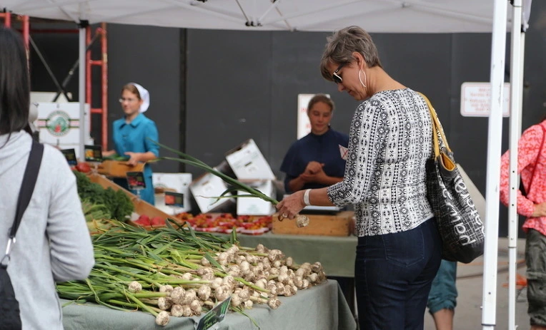 아미시 사람들이 농사 지어 온 풋마늘을 도시의 여인이 조심스레 고른다.