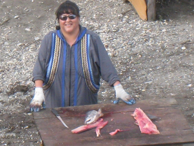 잡은 연어는 포를 떠서 말린다. 이 여자는 일분에 한 마리씩 다듬었다. 연어를 말리는 곳