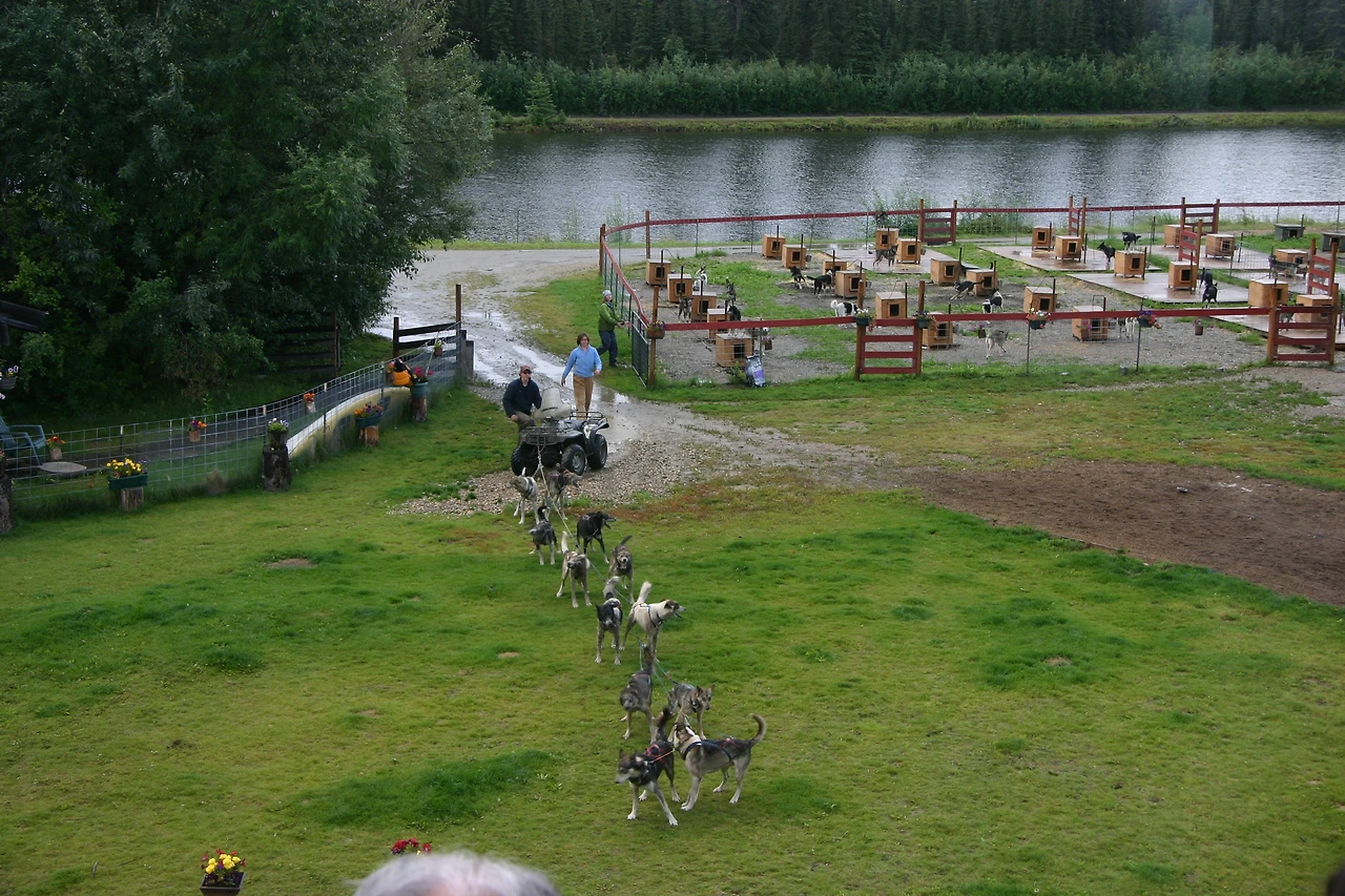 짧은 여름이 끝나면 개 썰매가 필수라 여름에도 계속 훈련시키고 있었다. 눈이 없어 개들은 소형트랙터를 끌며 훈련 중이다