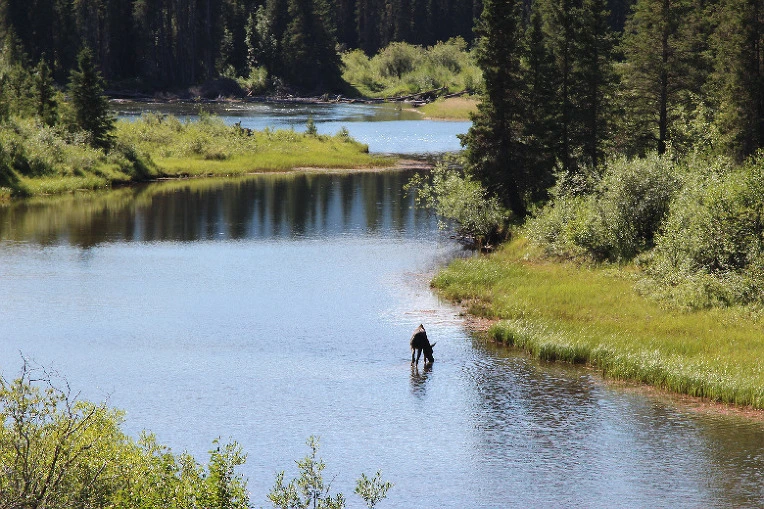 우리도 차를 세우고 내려다보니 저 아래서 무스가 강에 발을 담그고 아침식사 중이다.