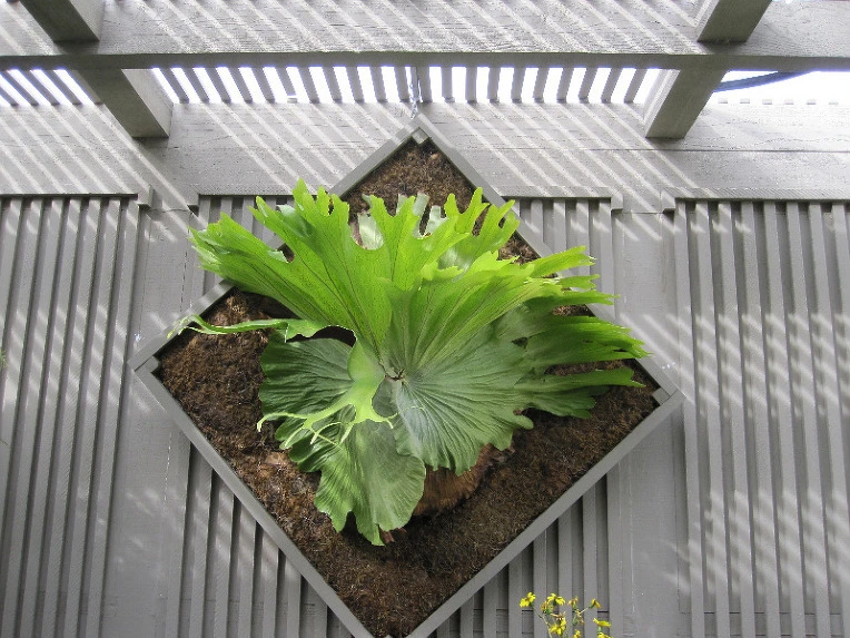 Elk의 뿔 같은 식물은 벽에 걸려있다.