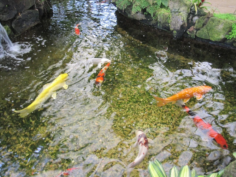 작은 인공연못에는 커다랗고 화려한 잉어들이 헤엄쳐 다니고