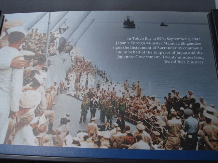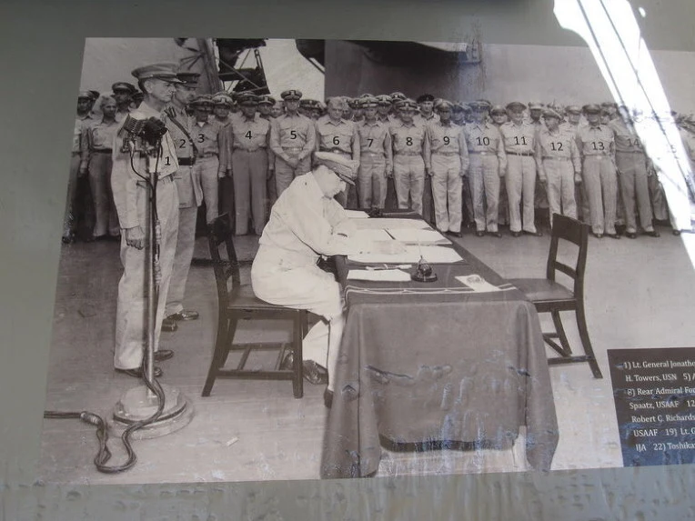 일왕을 대신해 일본 외무대신 마모루 시게미추가 항복문서에 서명할 때 배 안의 해군들이 모두 나와 이 역사적 사건을 구경했다.