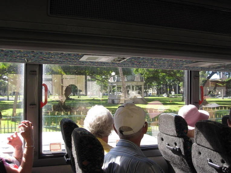 알록달록한 하와이안 셔츠를 입은 스미스라는 운전사 겸 안내자가 버스 앞에서 손님을 맞이한다.