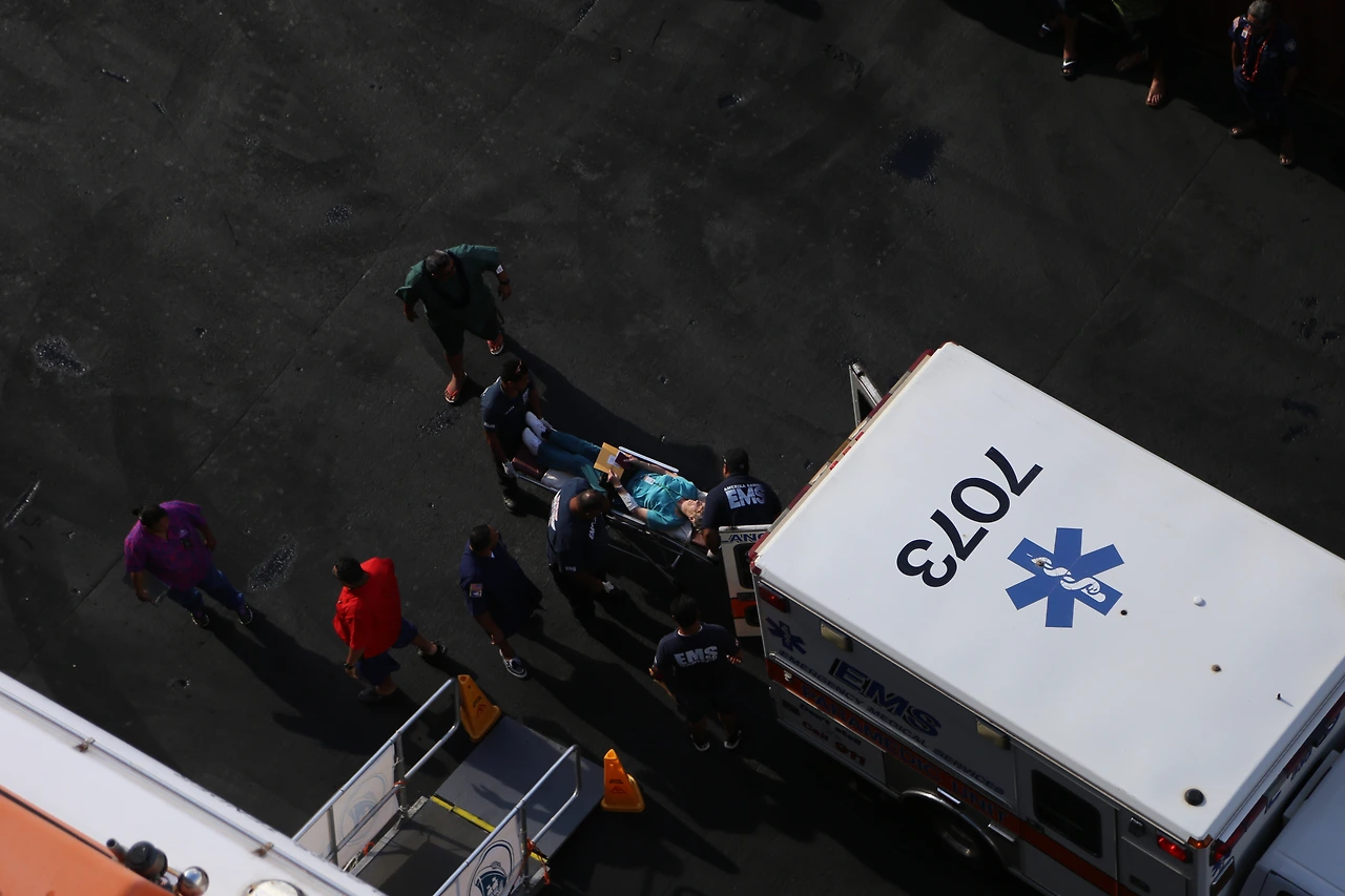 배는 컨테이너들이 잔뜩 쌓여있는 부두로 천천히 다가갔다. 배가 항구에 닫기도 전에 구급차 한대가 급히 들어온다. 배 안에 응급환자가 생겼나 보다. 들것이 배 안으로 들어오더니 조금 후 환자 한 명이 실려 나간다. 배 안의 승객 대 부분이 노인층이니 긴 여행에 환자가 생길 만도 하다. 배 안에서 사망하는 일도 종종 있다고 한다.