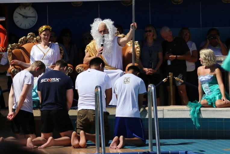 강의 후 11시 적도를 지나기 위해 특별한 세리머니를 한다고 해서 9층 수영장 가에 모였다. 적도를 지나가려면 죄를 지은 사람을 찾아내어 그 죄를 묻고 죗값을 치러야 한단다. 바다의 신이 죄를 묻는다.