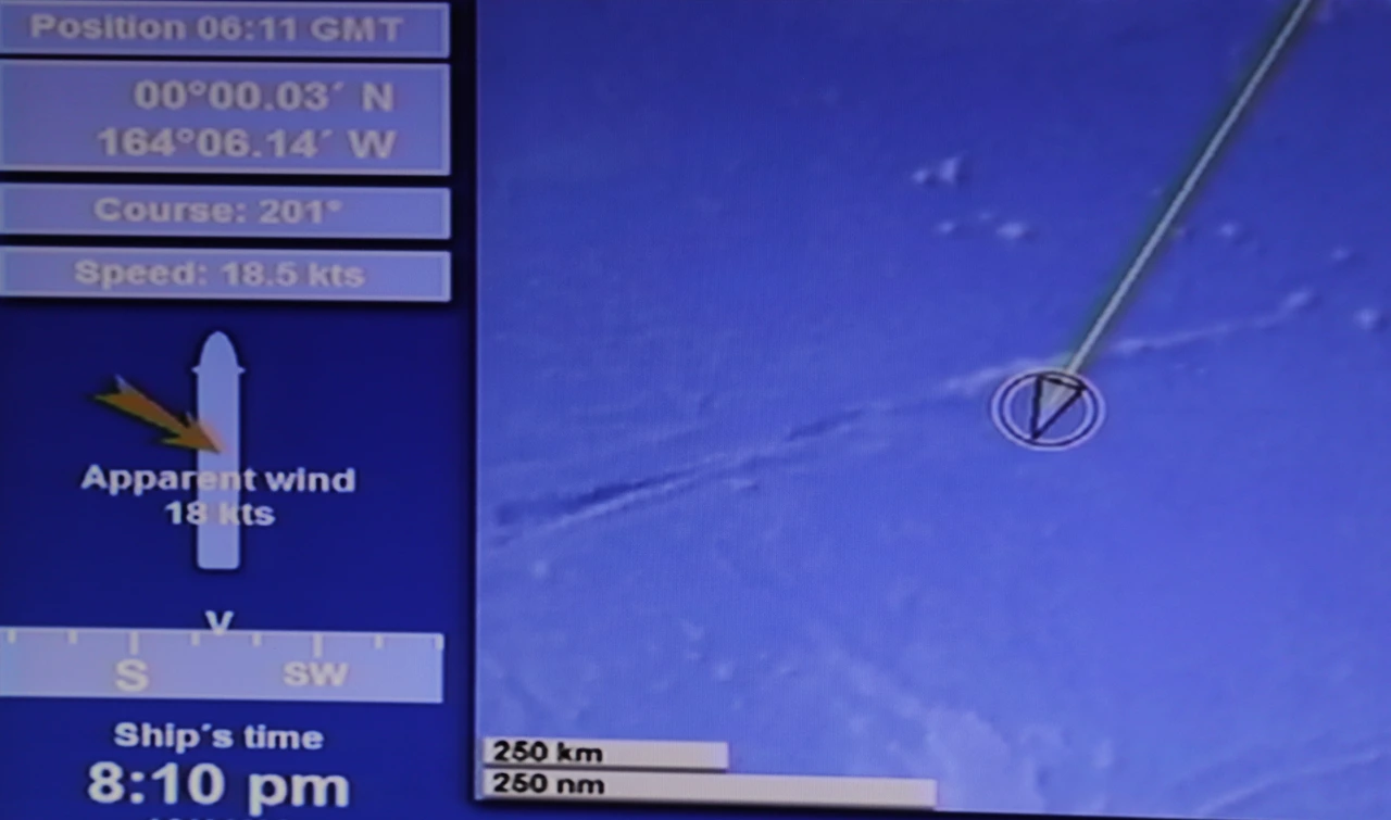 지구의 한가운데 보이지 않는 줄을 그어 놓고 북쪽은 북위, 남쪽은 남위로 구분하는 선이다. 적도는 0도이다. 적도를 지난다고 빨간 줄이 보이는 것도 아니다. 선장이 지나간다고 하니 믿는 거다. TV화면에서 계속해 항로를 보여준다. 남위 2도 서경 168도.. 수심 5240미터.